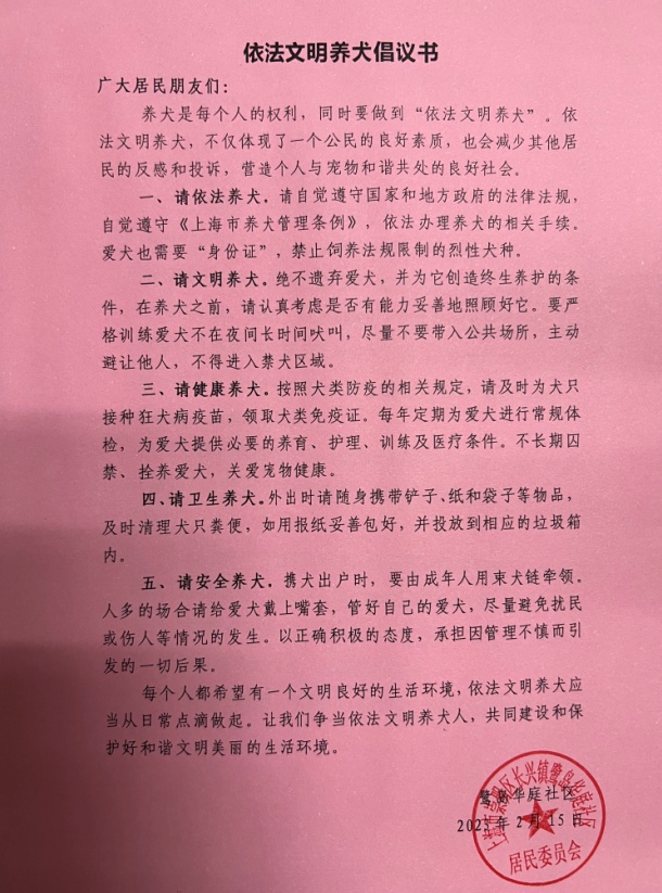 社区党员志愿者向居民们发放《依法文明养犬倡议书》,强调无证养犬、违规遛犬等违法违规行为的影响,普及文明养犬常识。