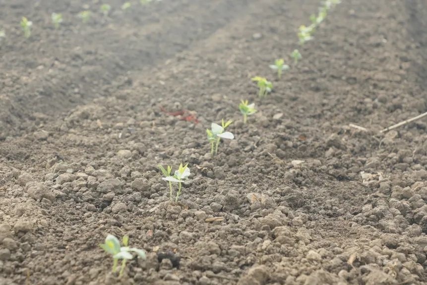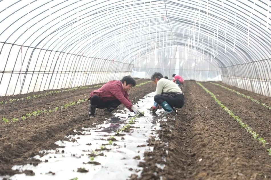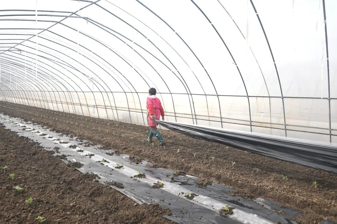 几位工人正忙碌着,相互配合熟练地在给长豇豆秧苗覆盖防寒地膜。
