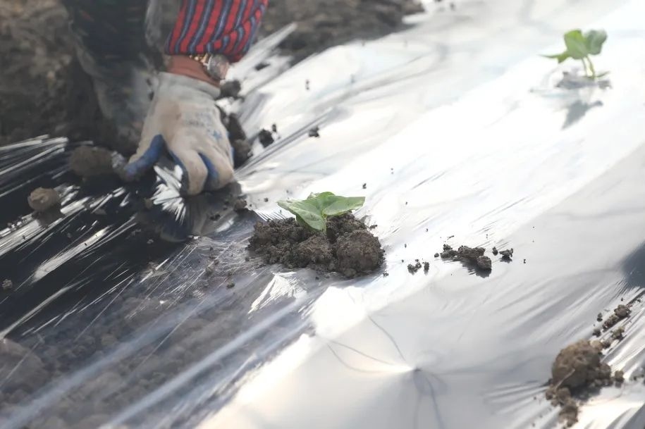 这个膜叫黑白膜,往年使用的都是黑色的膜,虽然保湿作用不错,但是秧苗的发根时间慢。现在使用的黑白膜很好地避免了这些问题,后续种植都会采用这种地膜。