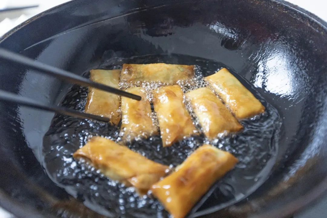 包好的春卷放入热油锅,炸至金黄后,一个个金黄的飘着清香的荠菜肉馅春卷满是春天的味道,咬一口,齿颊留香。春天吃春卷,也是寓意“有头有尾”、阖家欢乐。