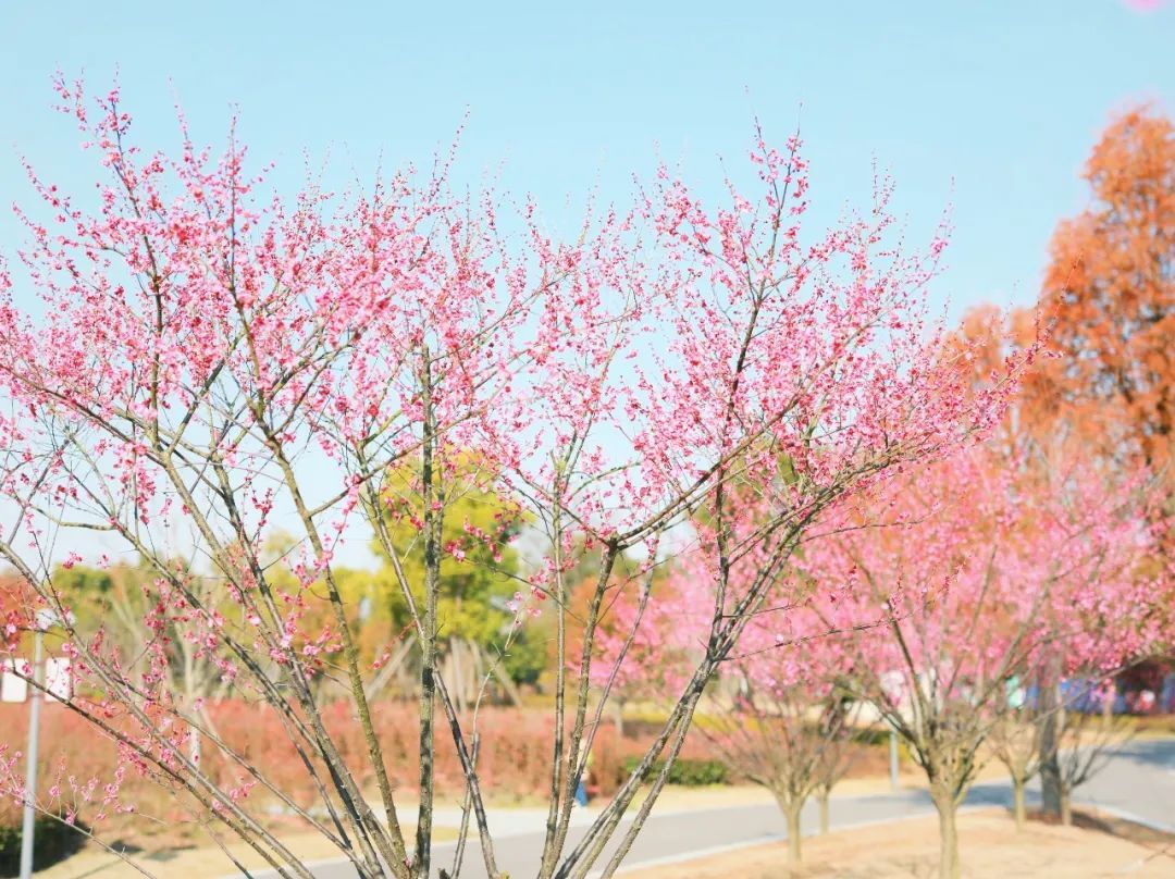 金海街道公园、道路上的梅花正相继开放