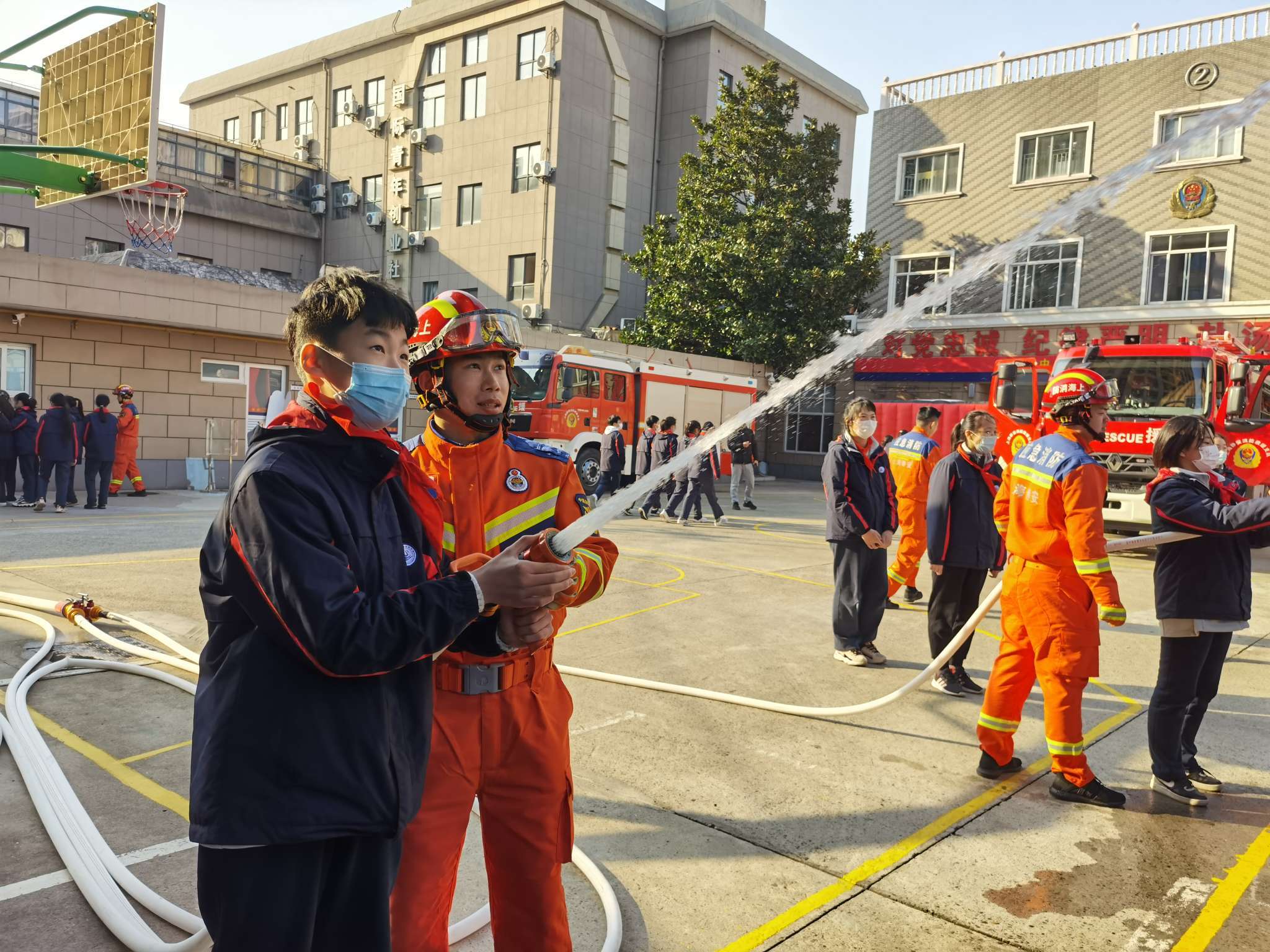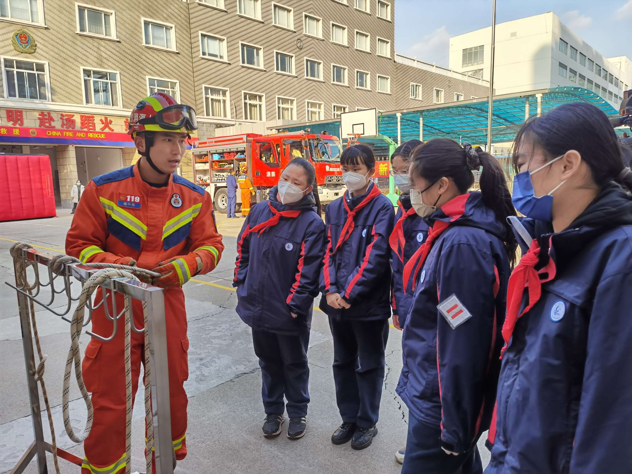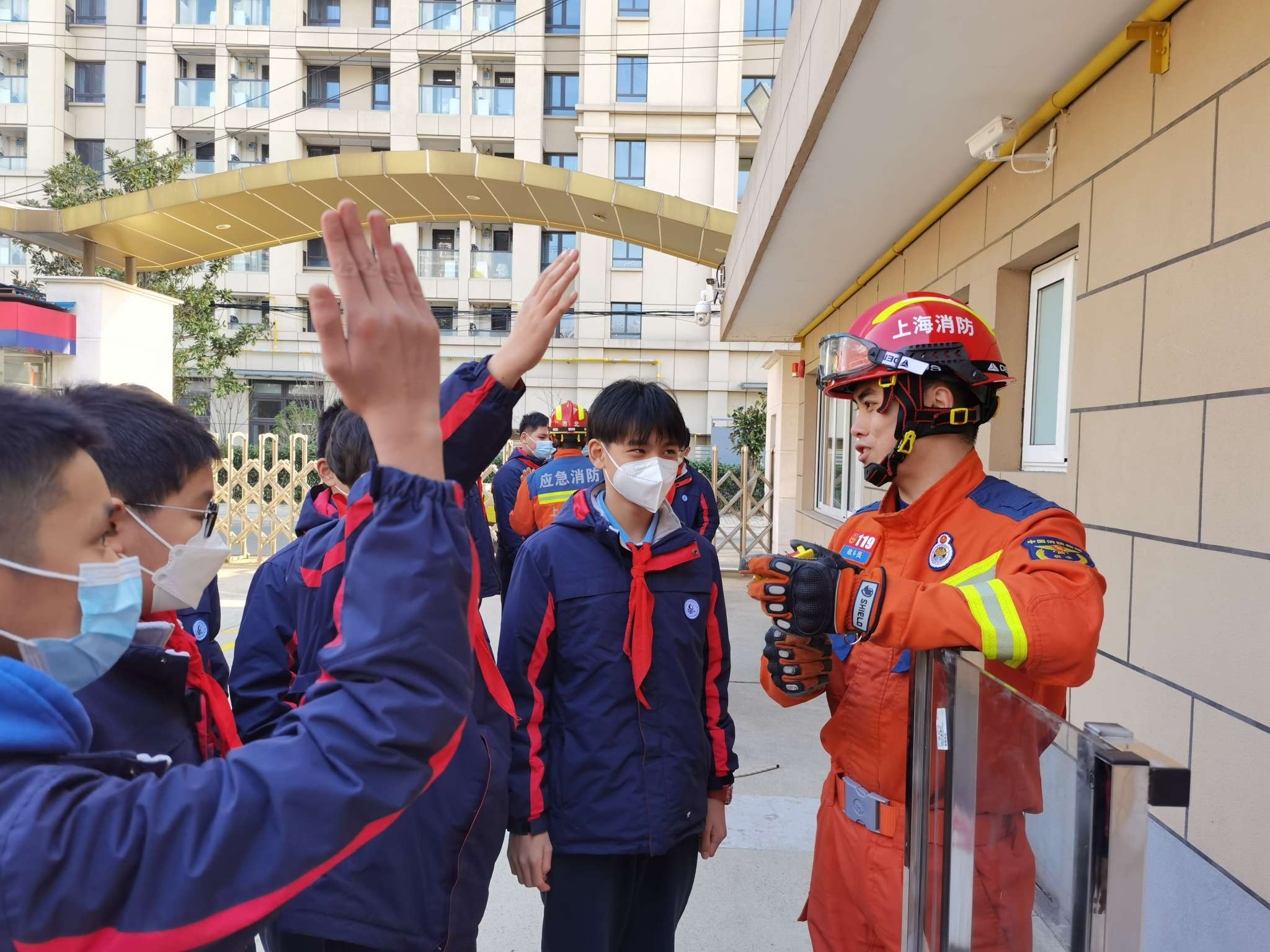 在市北消防救援站,彭浦第四中学的同学们身临其境地参与到消防活动体验中。同学们参观了营房、车库,学习了家庭常见火灾排查处置、火场逃生技巧,现场体验了逃生面罩、灭火器、逃生锤等设备的使用方法,掌握了绳结的基本方法,零距离学习防灾减灾知识与灭火自救技能。