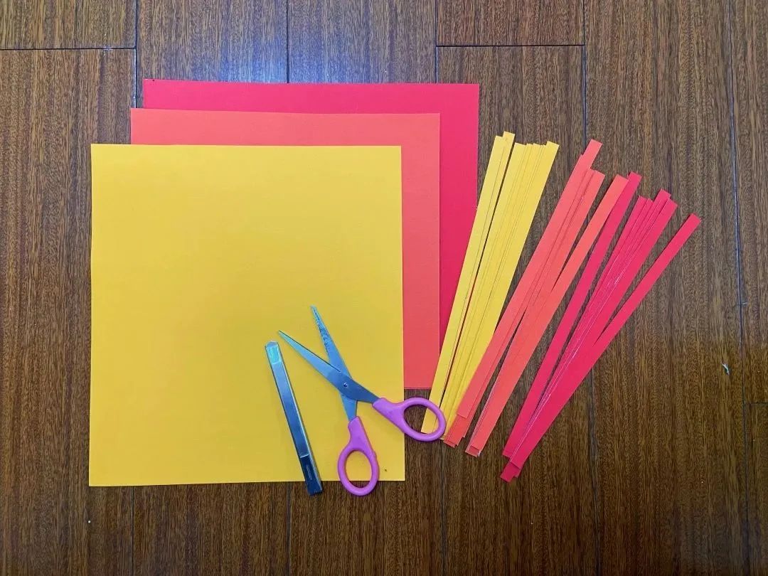3.将三张不同颜色的卡纸剪成卡纸条。