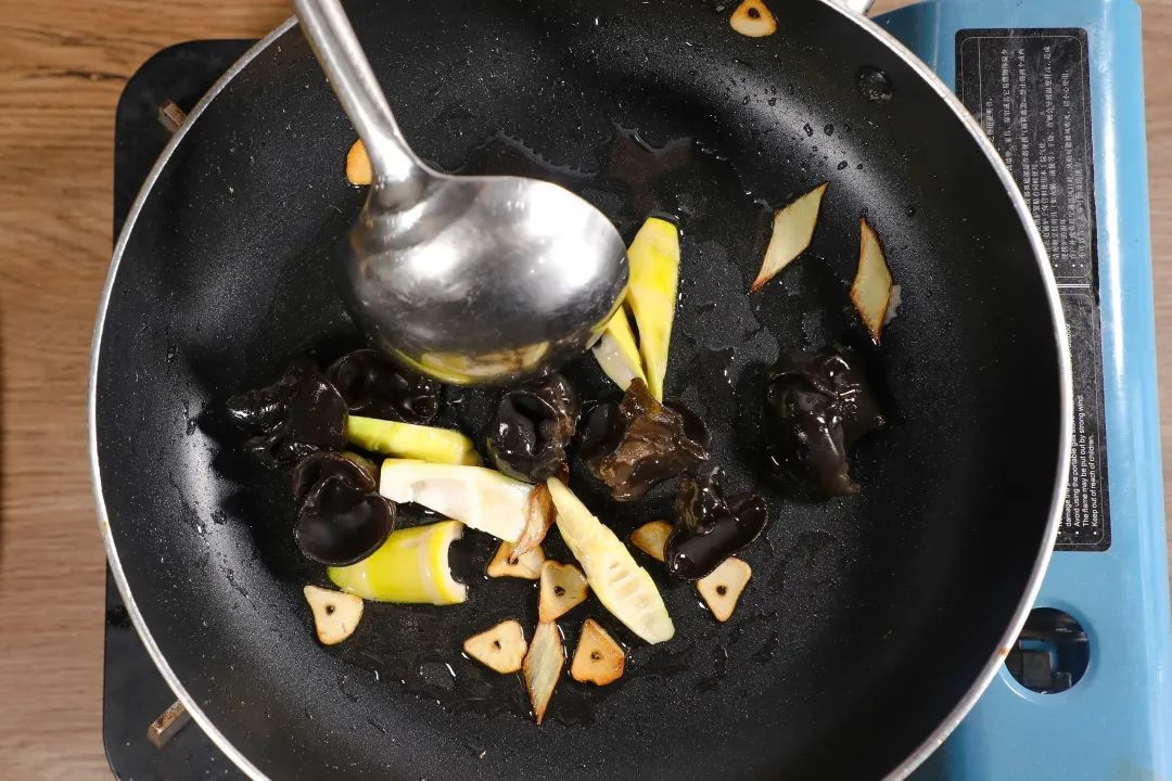 3.锅中加入调和油、蒜片、姜片,煸香后,加入春笋、蚕豆瓣煸炒。