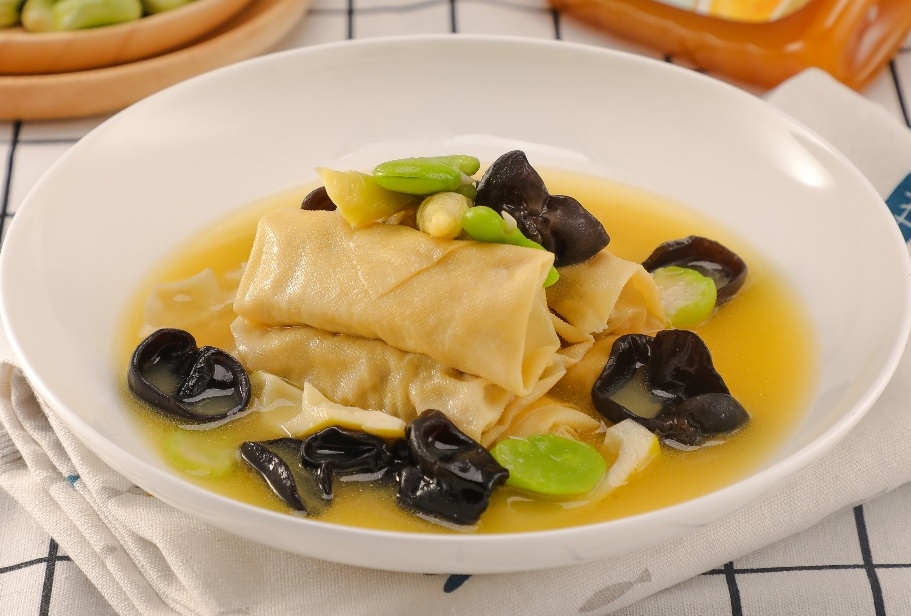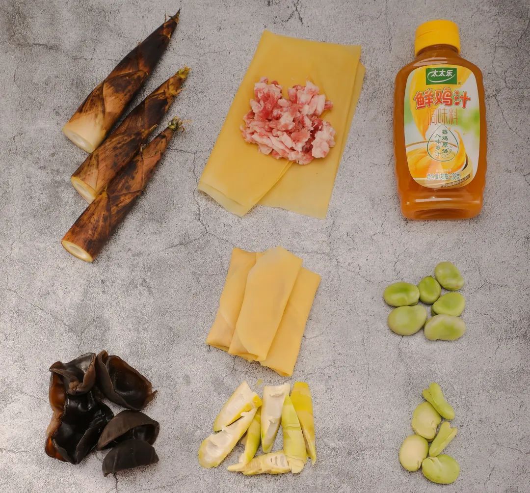 猪肉糜100克、薄百叶2张、蚕豆瓣30克(蚕豆去皮)、春笋100克、黑木耳30克(泡发好)、蒜片3克、姜片3克、鲜鸡汁调味料25克、调和油10克