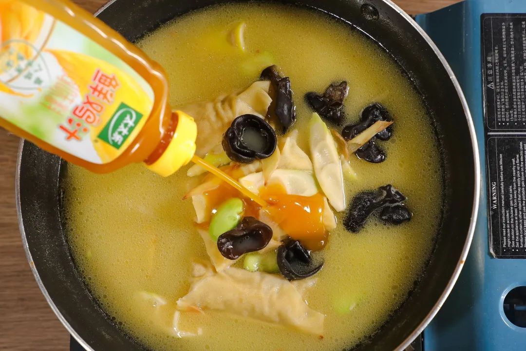 4.加水,放入百叶包、黑木耳、鲜鸡汁调味料,改用中火加盖焖煮,5分钟后倒入砂锅煲中烧开即可。