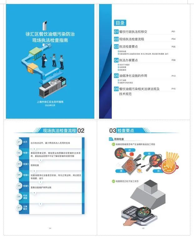 徐汇区生态环境局执法大队还专题组织人员对餐饮执法检查经验进行整理汇编,形成《徐汇区餐饮油烟污染防治现场执法检查指南》手册进行宣传发放。手册以生动活泼、浅显易懂的形式,详细介绍了餐饮油烟现场执法检查流程、执法检查要点、执法办案要点、油烟净化设施的作用和相关法律法规及技术规范,帮助街道相关人员全面熟悉餐饮油烟现场执法检查内容,快速掌握执法技能。