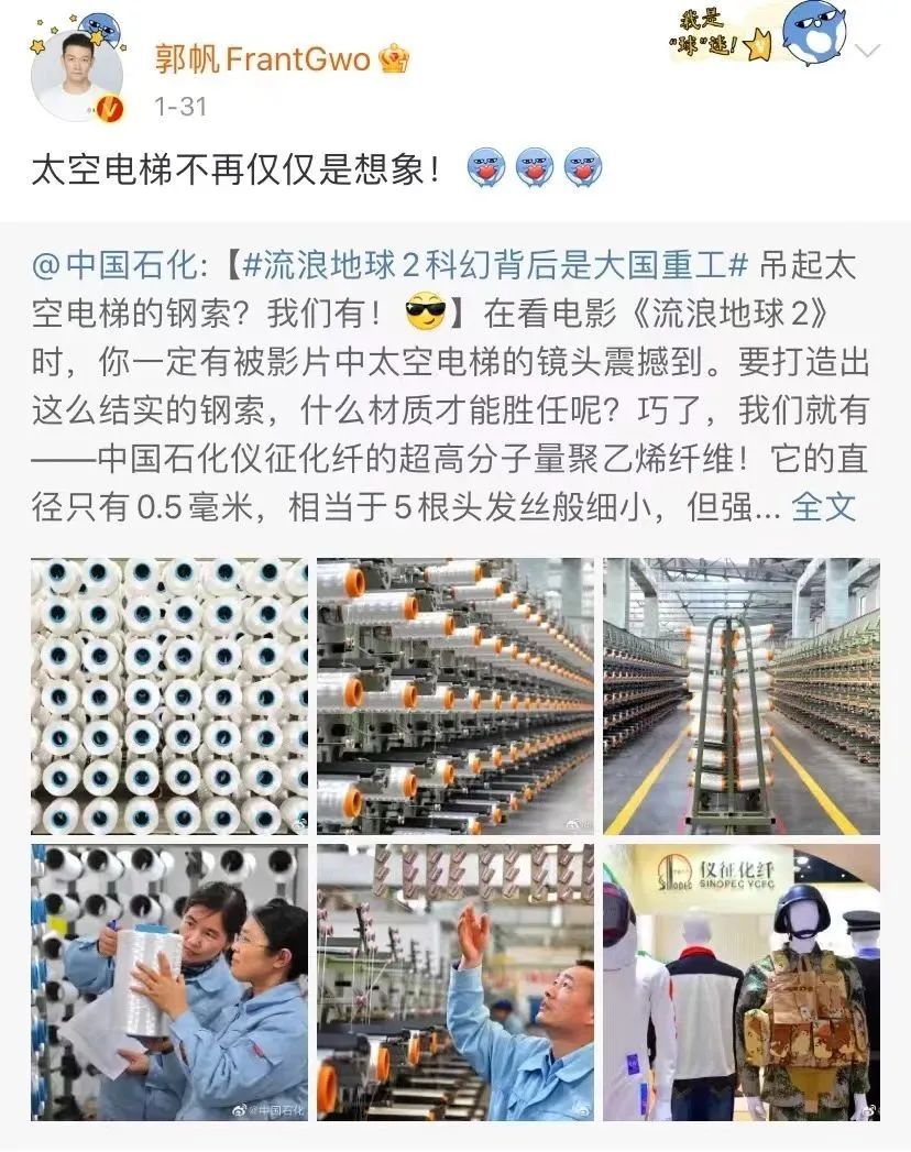 就像《流浪地球2》导演在转发“中石化新研发超高分子量聚乙烯纤维材料取得重大突破”这条微博时说的那样——