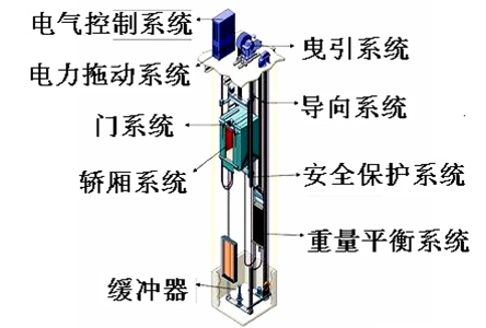 四大空间:机房、井道及底坑、轿厢、层站。八大系统:曳引驱动系统、导向系统、轿厢系统、门系统、重量平衡系统、电力拖动系统、电气控制系统、安全保护系统。