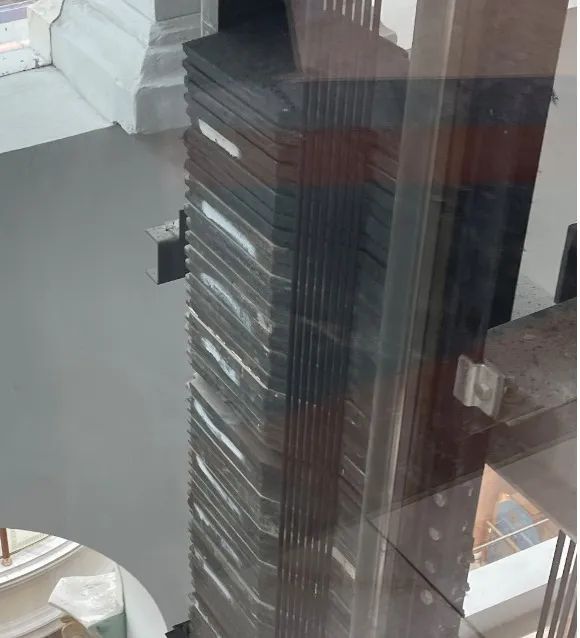 在我们日常乘用的垂直电梯内部,这个配重模块叫做对重(重量平衡系统),有时我们能在电梯上下时看到它在发力。