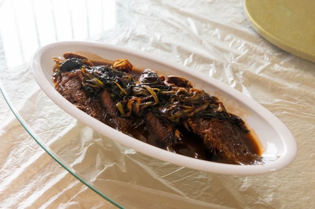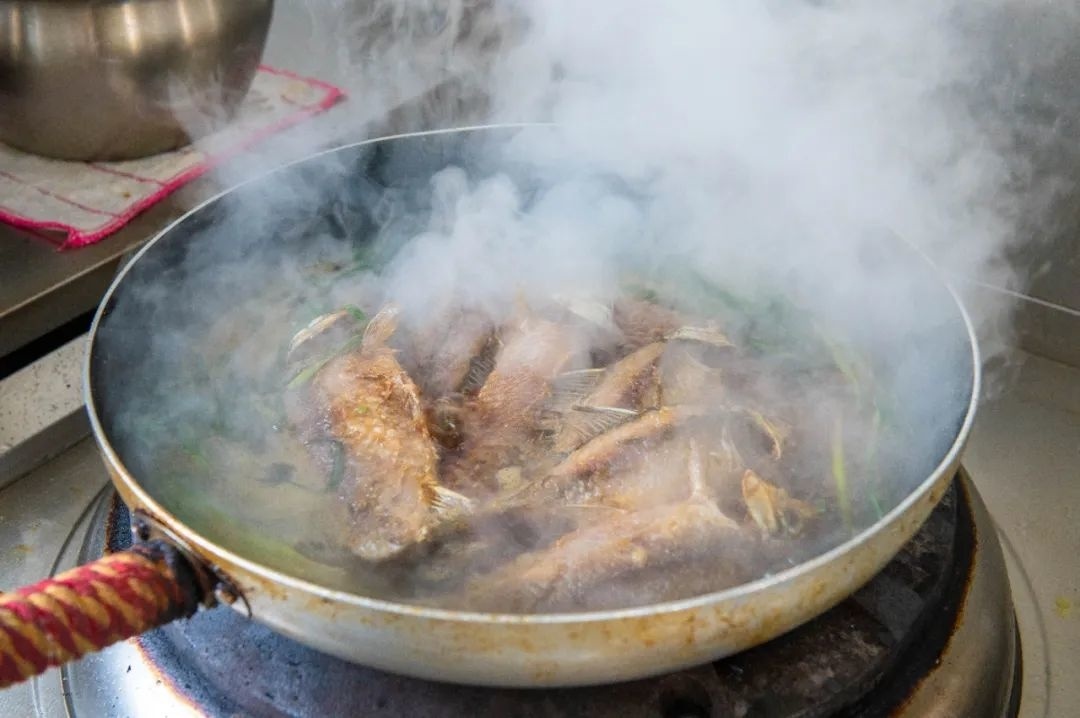 中午时分,走进鱼䲆鱻农家乐的厨房,香味扑鼻而来,只见大厨正在马不停蹄地烹饪鲫鱼。起锅热油,然后将鱼煎至两面略焦黄,再倒入滚烫的热水,待汤水呈奶白色后,再加入豆腐、胡椒粉等配料。不一会儿,一道鲫鱼豆腐汤就完成了。为了满足不同游客的口味需求,本月鱼䲆鱻推出了”鲫鱼三吃“。除了营养丰富的鲫鱼汤外,还有味道鲜美的葱烤鲫鱼和鲫鱼塞肉。