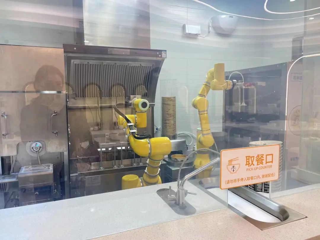 这家店的对面,上周又有一家机器人面馆开业。羊肉面、黄鱼面、大排素鸡面、还有《狂飙》同款猪手面……各种口味一应俱全。消费者只要在门口的自助点餐机上选择想要的品类,全透明厨房里的机械臂就会开始工作,压面机中的面粉变成一缕缕面条,再随着机械臂的转动,面条被煮成一碗热汤面,整个过程只要2分钟。