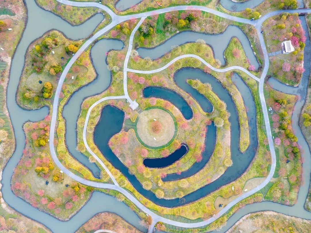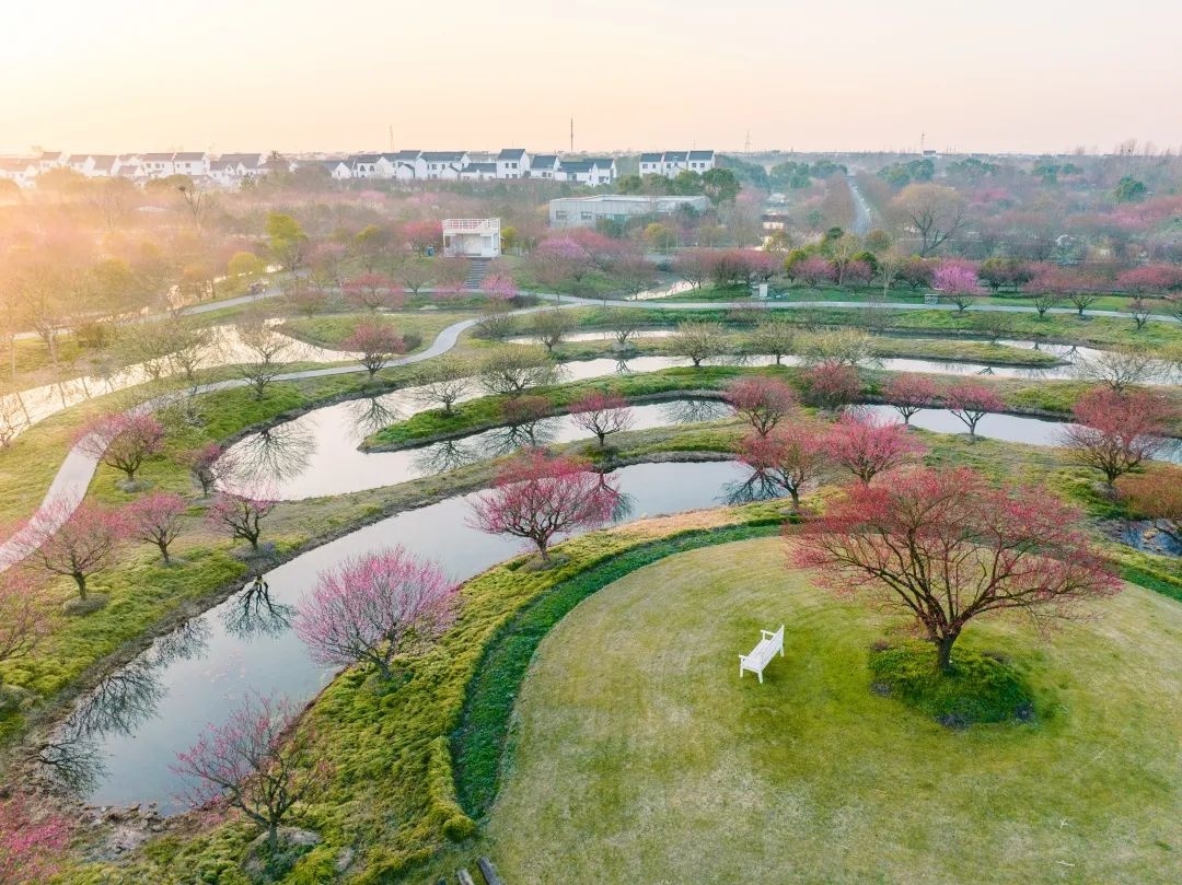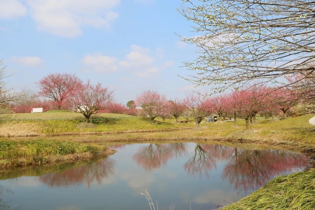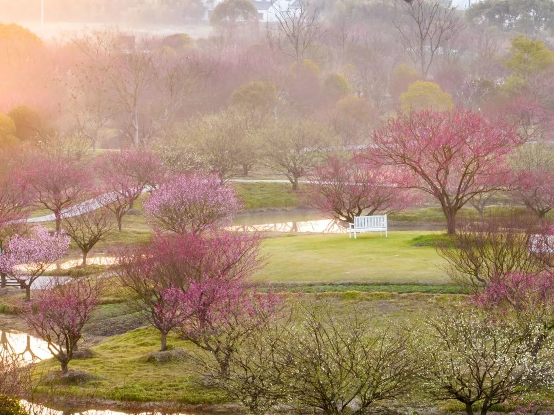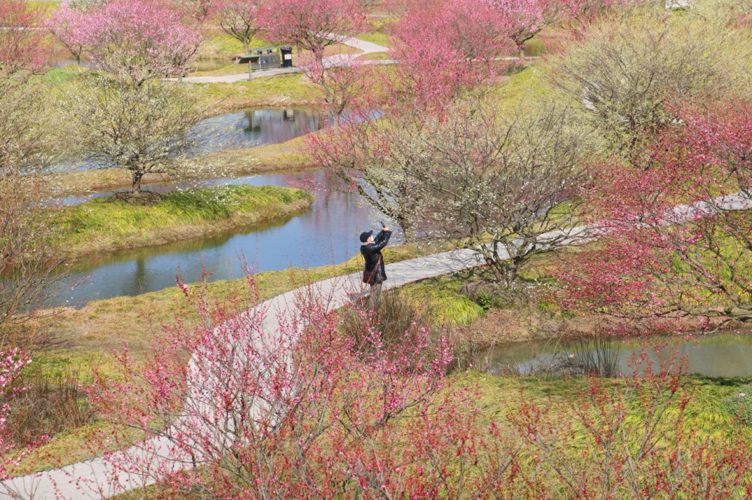 行走在梅园内,阵阵幽香飘来。成片的梅花竞相开放,层层叠叠,花开如云。满树繁花,散布在水渠之间,花影婆娑,倒映在水中,别有一番韵味。从空中俯瞰,漫山遍野的梅树与曲折蜿蜒的地形,相映成趣,形成了别样的初春美景。