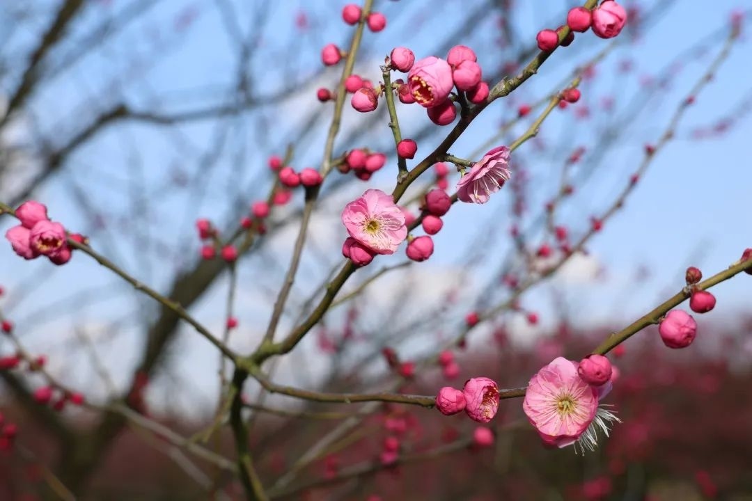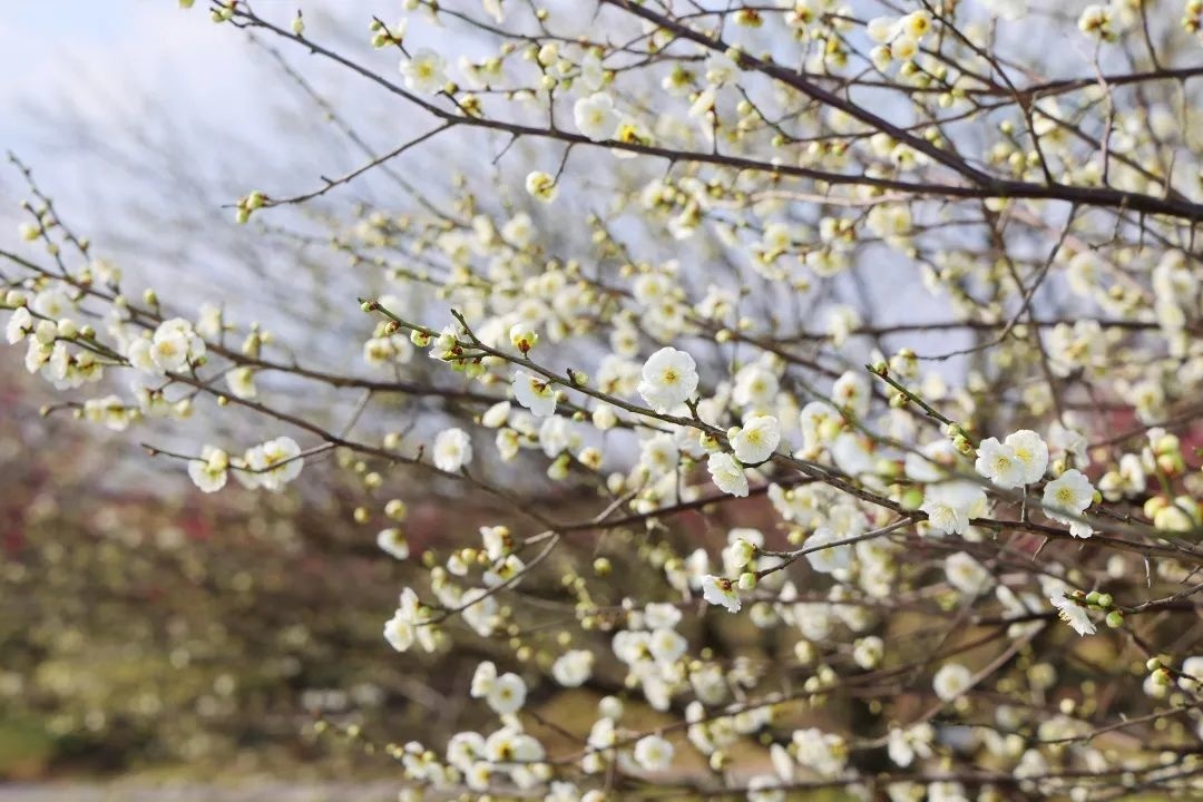 花开海上生态园的梅花占地面积300亩,共有50多个品种共1万多株,主要品种为江梅、绿萼、宫粉、垂枝和龙游梅,分布在梅园内的梅溪香岭、梅影曲径和梅宫。据了解,随着天气转暖,梅花的最佳观赏期可以持续到3月上旬。