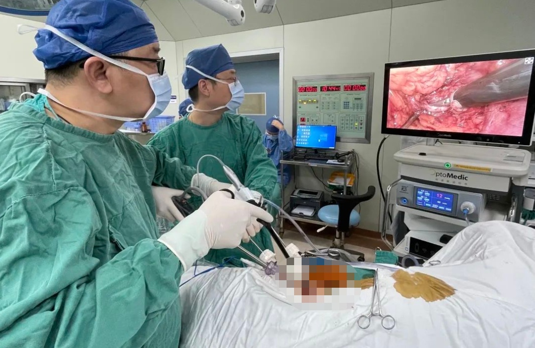 手术当天,泌尿外科肿瘤小组全员上阵,患者全身麻醉后,首先进行侧卧位的腹腔镜肾癌根治术。两个小时后,肾脏肿瘤被顺利取出,随后医护将病人平缓翻至仰卧截石位,进行经尿道膀胱肿瘤电切术,很快这部分手术也顺利完成。在麻醉科和手术室护理团队的全力配合下,泌尿外科医疗团队为向先生成功进行一次微创手术治愈罕见泌尿系统双原发癌症。