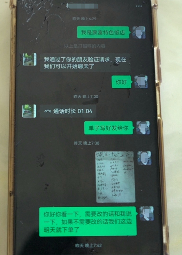 原来,2月15日晚18点多,老板娘任女士接到电话,对方自称是某学校老师,要预定三桌饭菜,每桌1300元,共3900元。任女士以为是正常业务,欣然接受,便加了对方微信。通过微信,对方称要额外预定35份佛跳墙,共计44500元,并让任女士扫码代购并加工。任女士自知农家饭店业务体量小,便电话告知了丈夫陈先生。