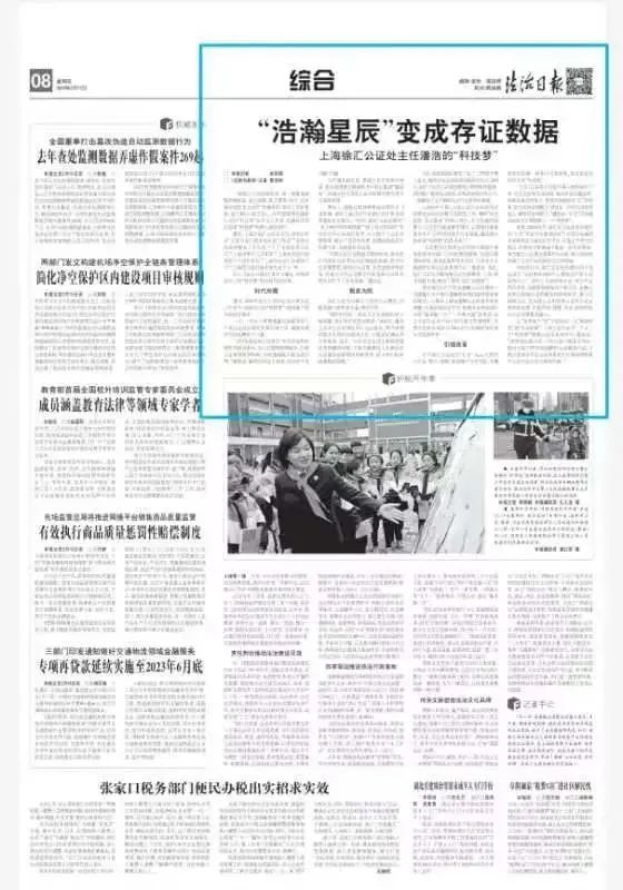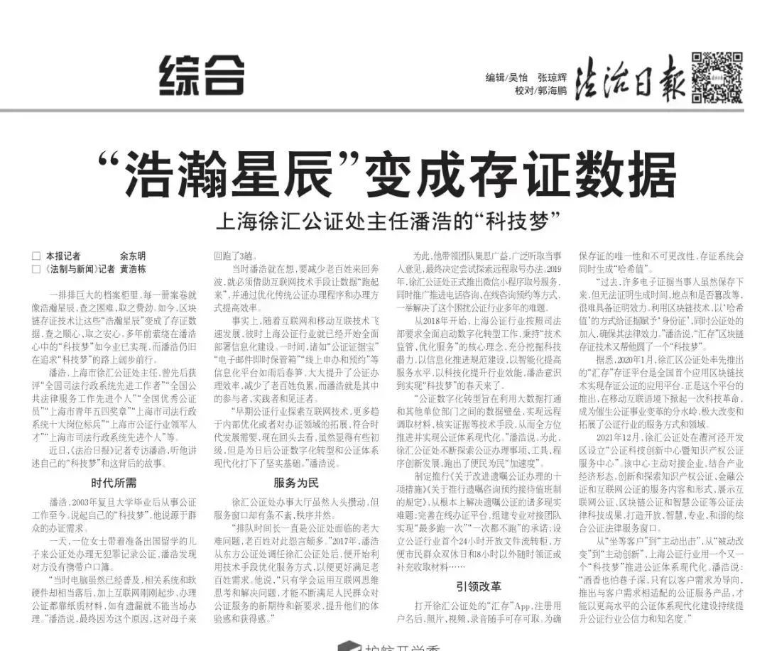 据悉,2020年1月,徐汇区公证处率先推出的“汇存”存证平台是全国首个应用区块链技术实现存证公证的应用平台。正是这个平台的推出,在移动互联语境下掀起一次科技革命,成为催生公证事业变革的分水岭,极大改变和拓展了公证行业的服务方式和领域。