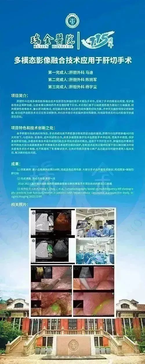 瑞金医院肝胆外科具备完善的临床技术水平和规范化诊疗能力,由现任上海市医学会普外科分会肝脏外科学组副组长陈拥军担任科主任和学科带头人。现阶段,肝胆外科依托肝脏肿瘤MDT多学科团队的强大诊疗实力,在技术应用上依靠先进影像技术发展,从诊疗的各个角度融合各种影像资料,以精准微创的理念突破手术治疗的难关,服务广大患者。