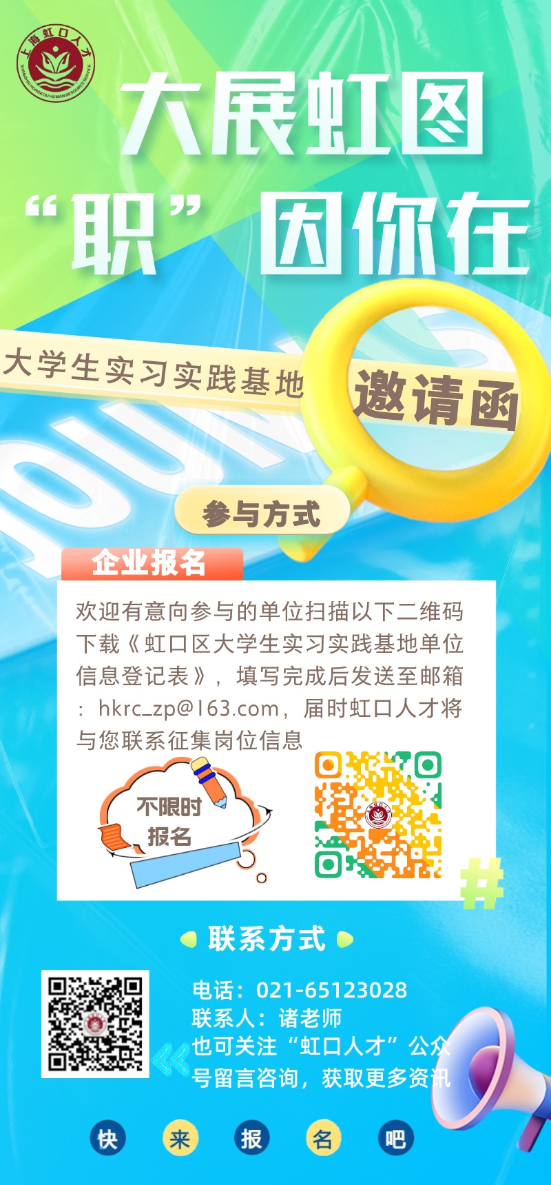 记者从区人社局获悉,为建立起高校、人才、企事业单位多方面的精准对接,虹口区大学生实习实践基地邀请有意愿参与的企事业单位加入。详见↓