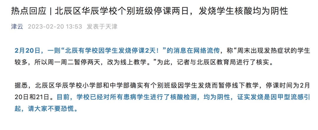 另据微信公号“津云”消息,天津北辰区华辰学校小学部和中学部也有个别班级因学生发烧而暂停线下教学,停课时间为2月20日和21日。目前,学校已经对所有患病学生进行了核酸检测,均为阴性,证实发烧是因甲型流感引起。