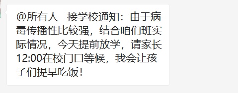 同日,一张截图在浙江金华市民朋友圈中传播,“由于病毒传播性比较强,结合咱们班实际情况,今天提前放学,请家长12:00在校门口等候。”