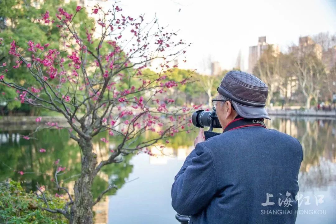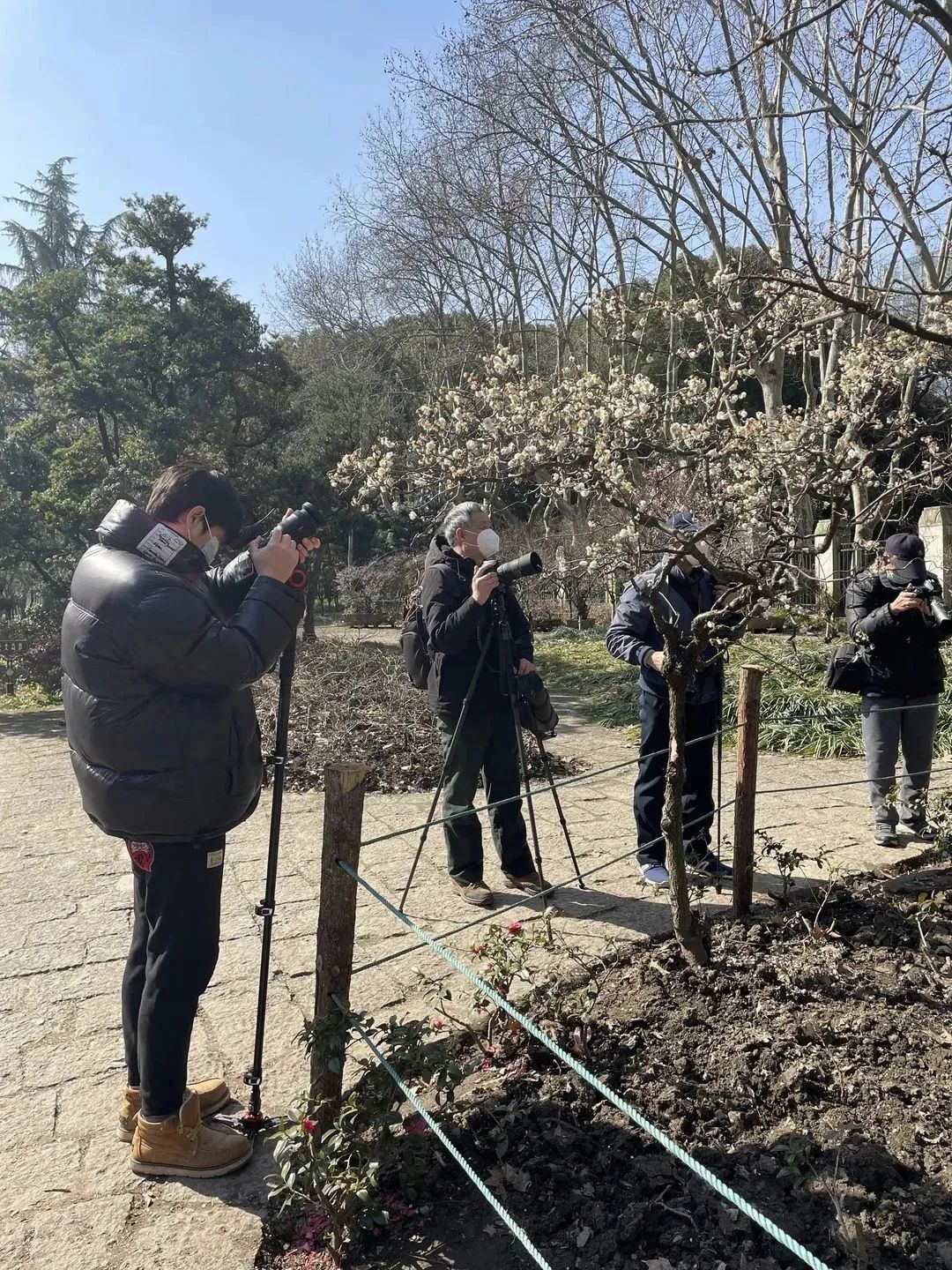 梅园里聚集了很多摄影爱好者,家住四川北路的施百成老先生也是其中一位。这段时间,他几乎天天都“泡”在这里。施老伯热情地做起了大家的讲解员,他说:“这梅园里最珍贵的梅花,在我看来当属龙游。你看它的形态,自然弯曲,就像一条龙那般;龙游开出来的花是白色重瓣花,非常与众不同。”
