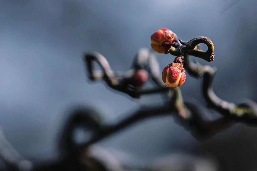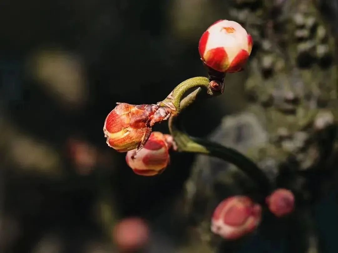 正是因着花期不同,此时的梅园呈现着不同阶段的梅花姿态。有的还是“紫芽红甲爆春枝”,正是一副含苞待放的景象;有的则已是“初春锦绣铺千树”,朵朵怒放娇艳欲滴。