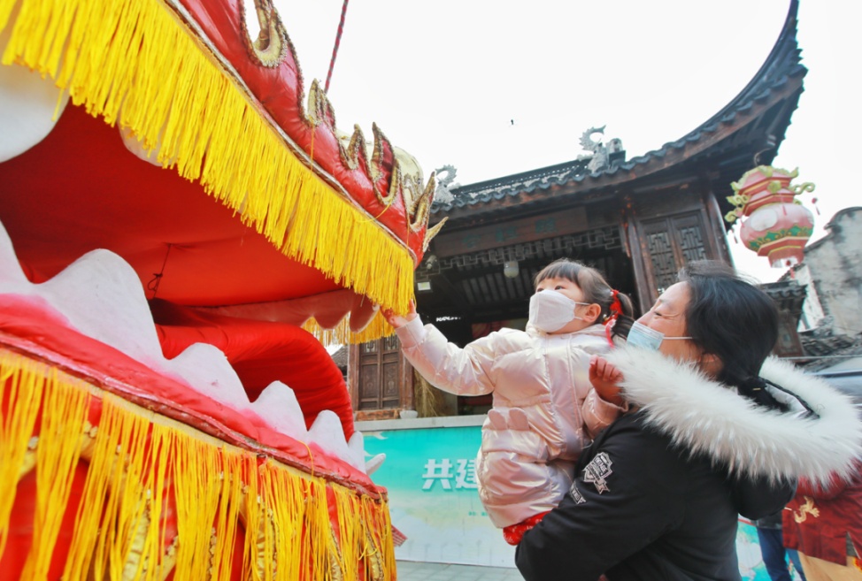 龙头先行向东,在三林老街牌楼前短暂停留,留待市民拍照;随后就是一个潇洒转身,折返向西。这时,越来越多的老街居民从二楼窗户探出头,掏出手机记录这一民俗时刻。行街队伍行至老街上的第三座仿古桥时止,之后将大龙头送回“照胆台”前,不少大人还抱起孩子摸龙头、扯龙须,祈福新年行好运。