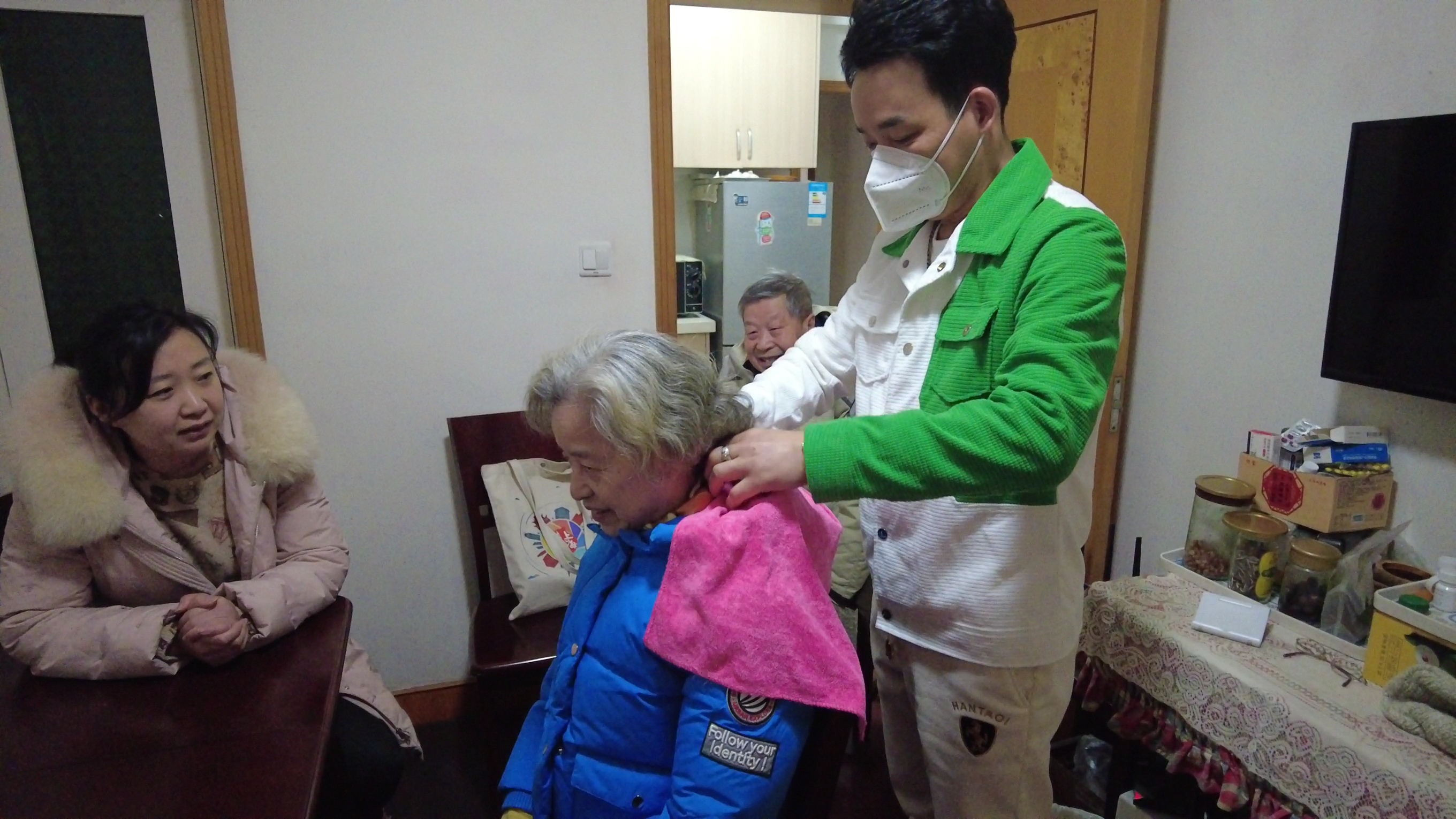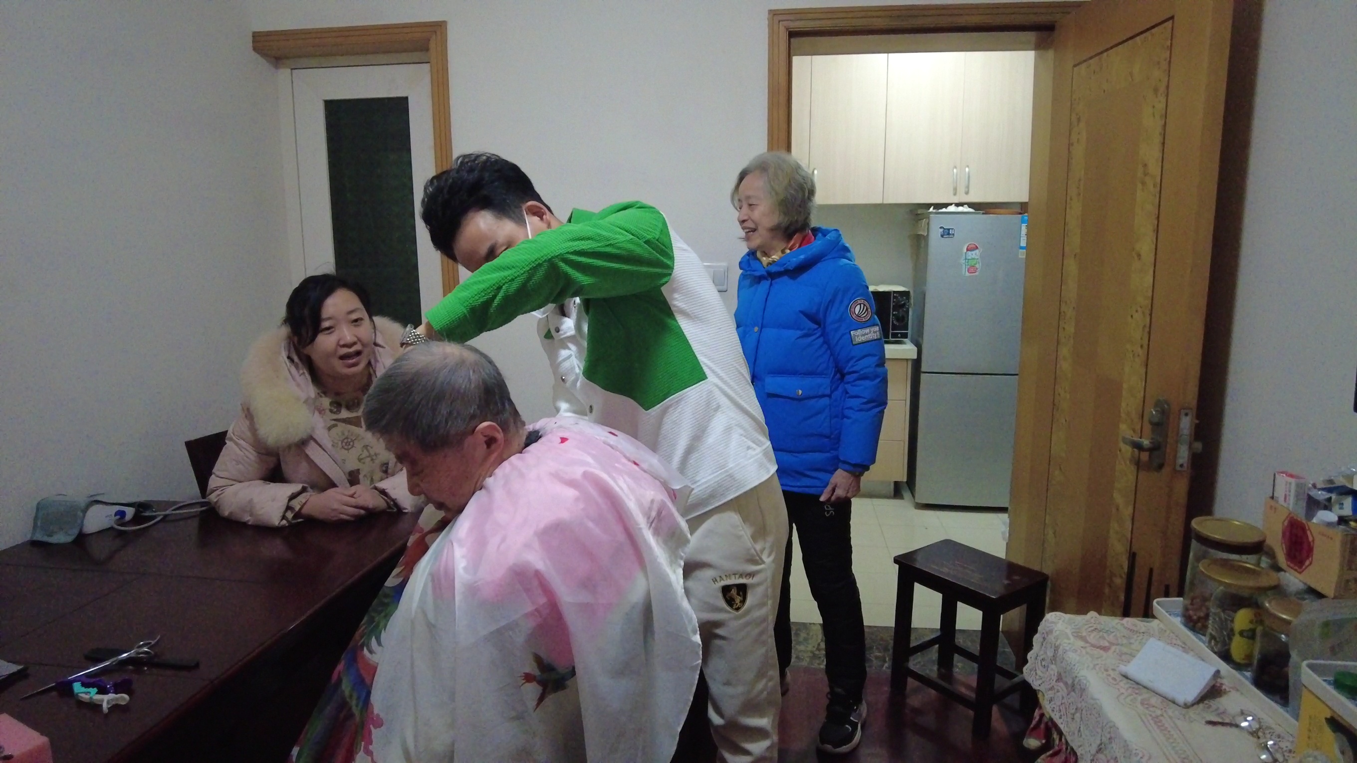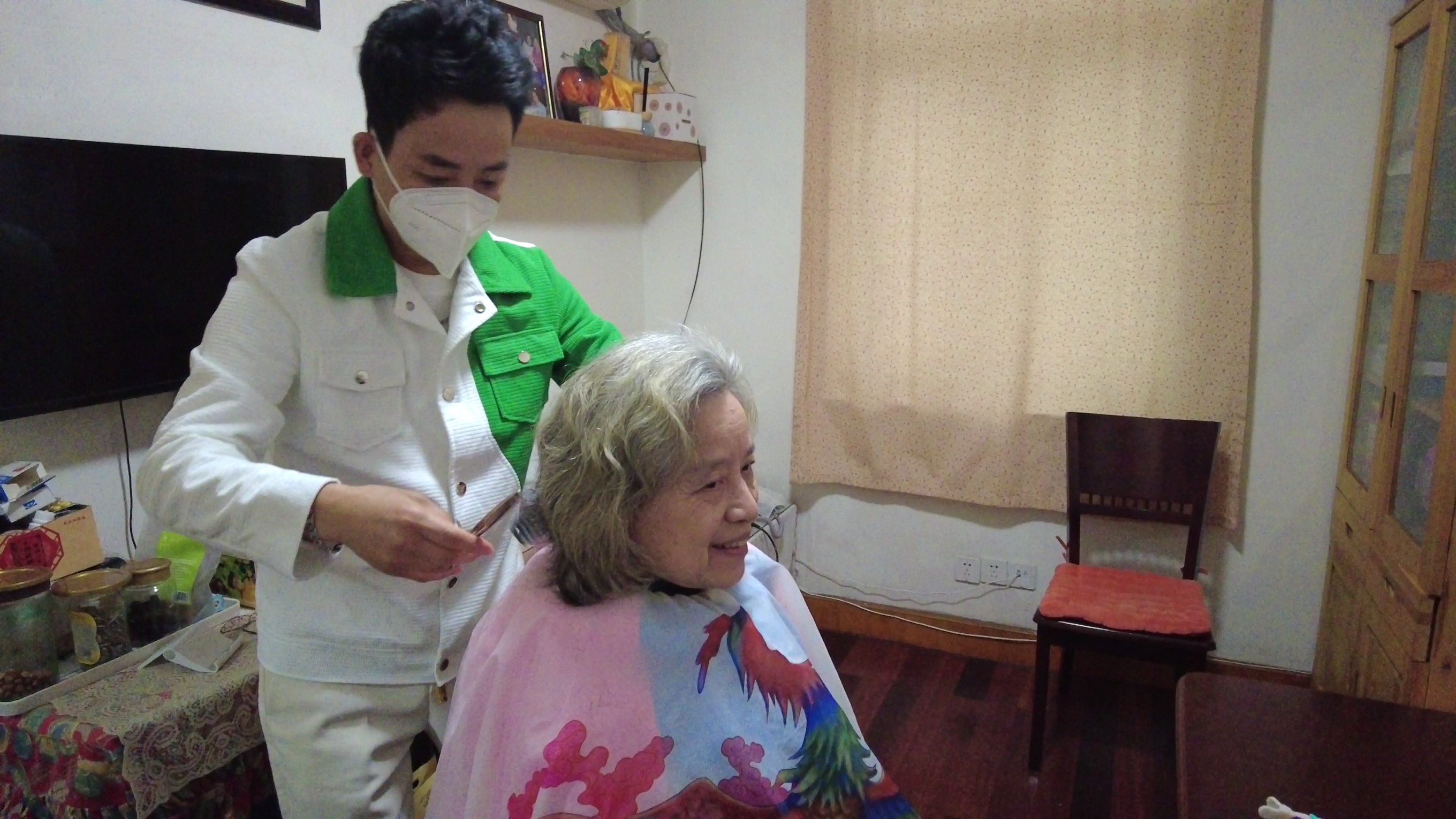 “阿姨剪一剪,年轻很多,今天二月初二龙抬头,鸿运当头,一年身体健健康康。非常感谢。”在居委会工作人员的陪同下,小何来到了徐阿婆老两口家中,话不多说,直接就开启了理发模式,徐阿婆的头发已经有三个多月没剪过,原本的短发长长了不少,徐阿婆介绍说,自己和老伴两个人至今还没有“阳”过,所以日常生活非常的小心翼翼,非必要不出门,所以理发这事就一直耽误下来,没想到街道居委对自己那么关心,安排了上门理发,还是在“龙抬头”的好日子里,这样的待遇着实让老两口激动不已。