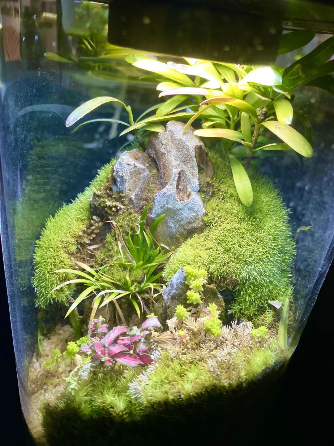 微景观的缸体铺底一般用三种材质,轻石、水苔和配方土。顺序为最下层铺轻石,中间水苔,上层配方土。