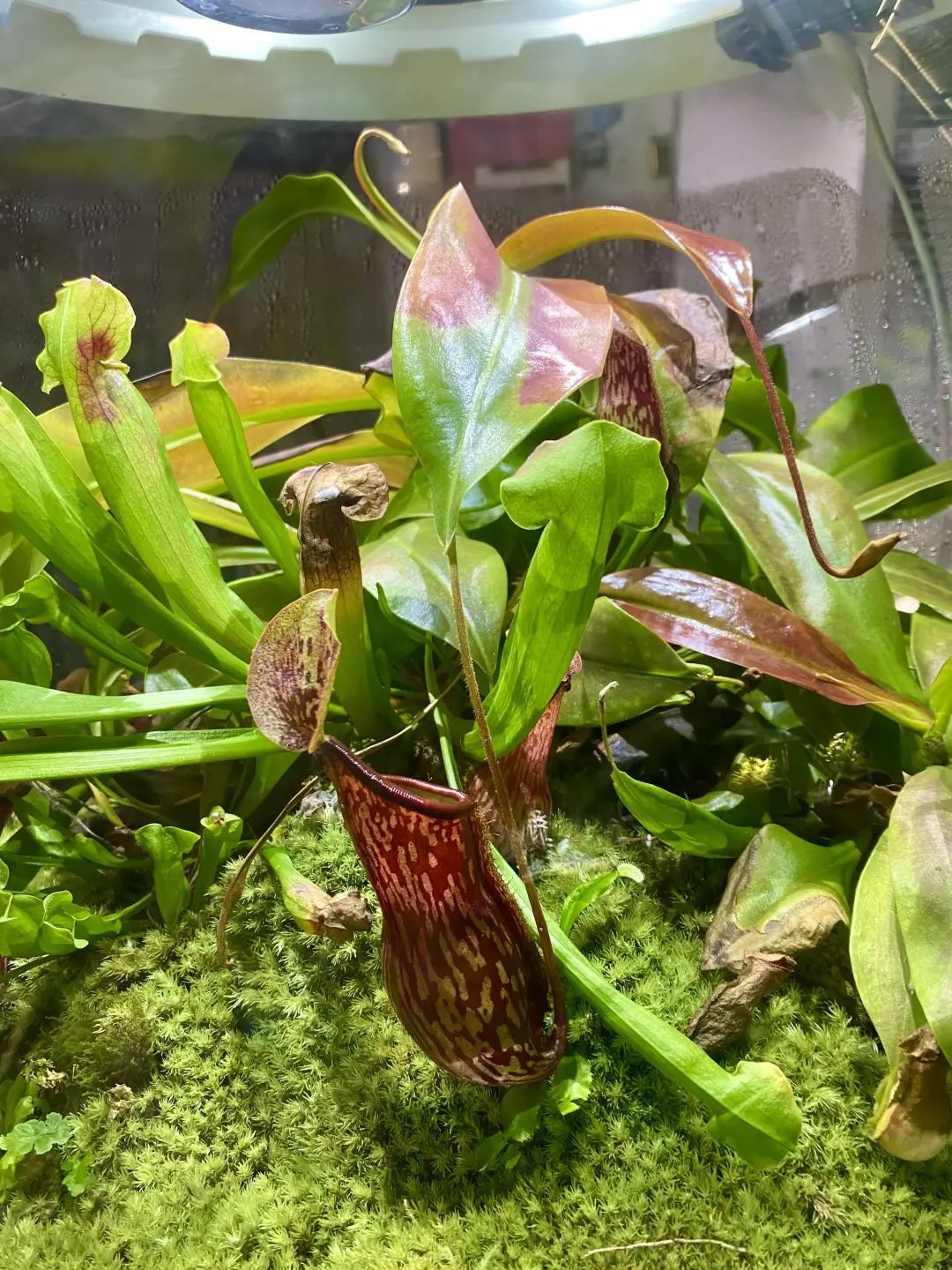 多肉、蕨类和藓类喜湿的植物都是拿来填满空间的最佳植物。空间够大想要更考究点,可以摆上猪笼草、文竹等。