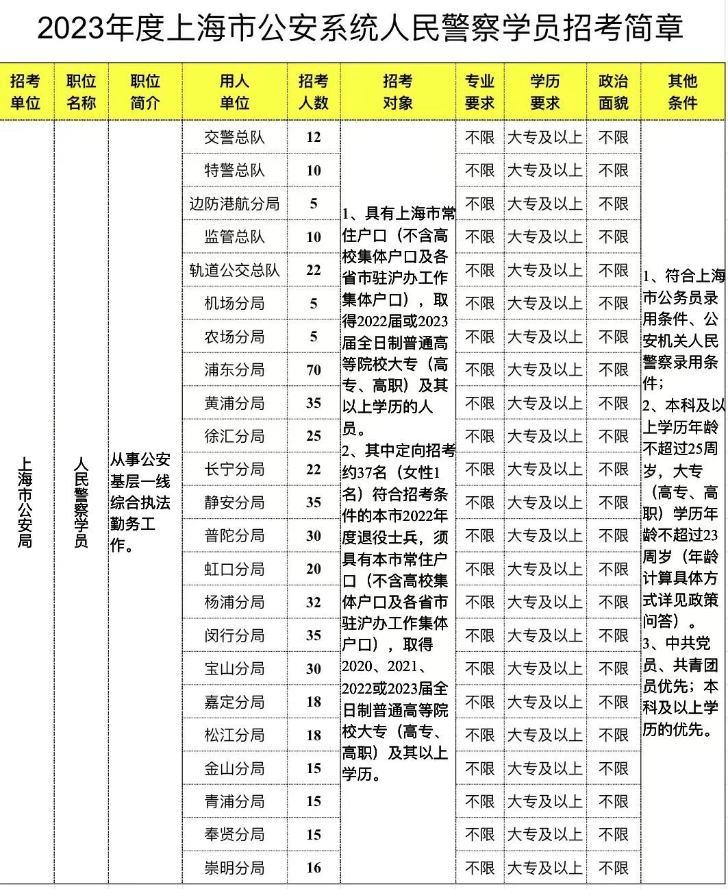 市公务员局介绍,2023年上海市公安、法院系统警察学员招考启动,计划招考公安系统人民警察学员500名(其中女性50名);计划招考法院系统司法警察学员25名(其中女性3名)。