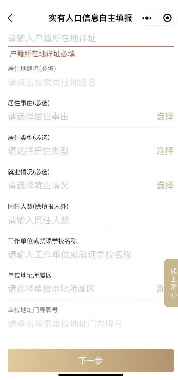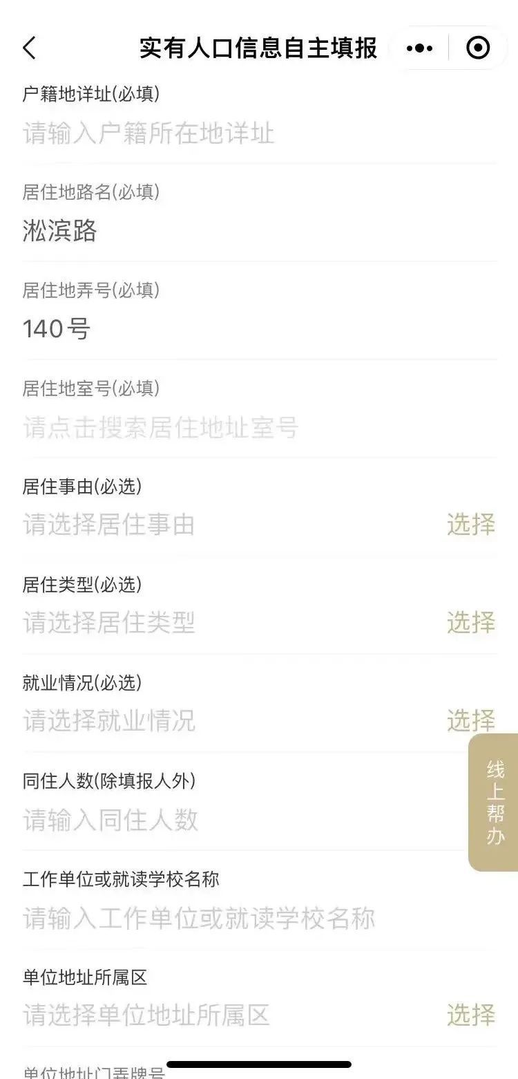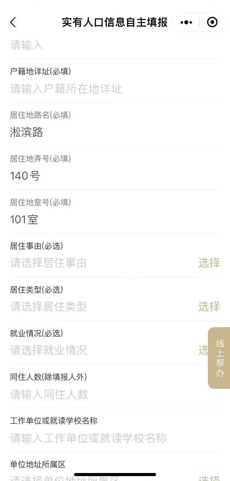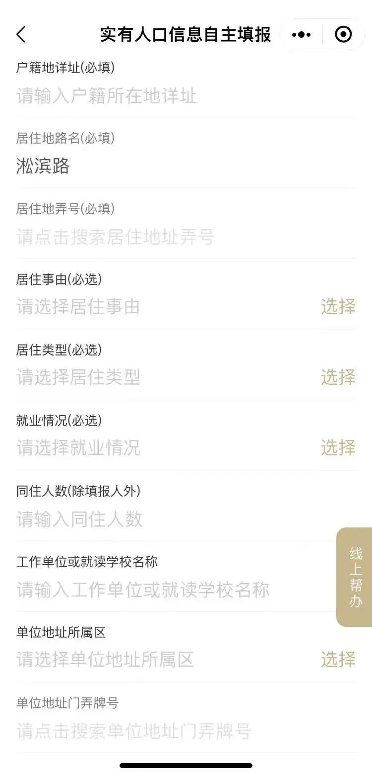 申报人须填写真实有效的居住地路名、门弄号牌以及具体的户号室号等必填居住事由和居住类型。