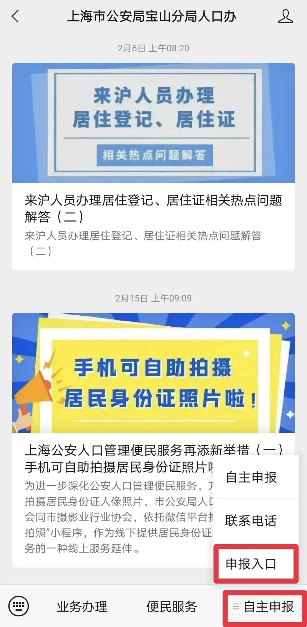 关注“上海市公安局宝山分局人口办”微信公众号,添加关注后,在“自主申报”一栏“申报入口”按键直接开始自主填报。