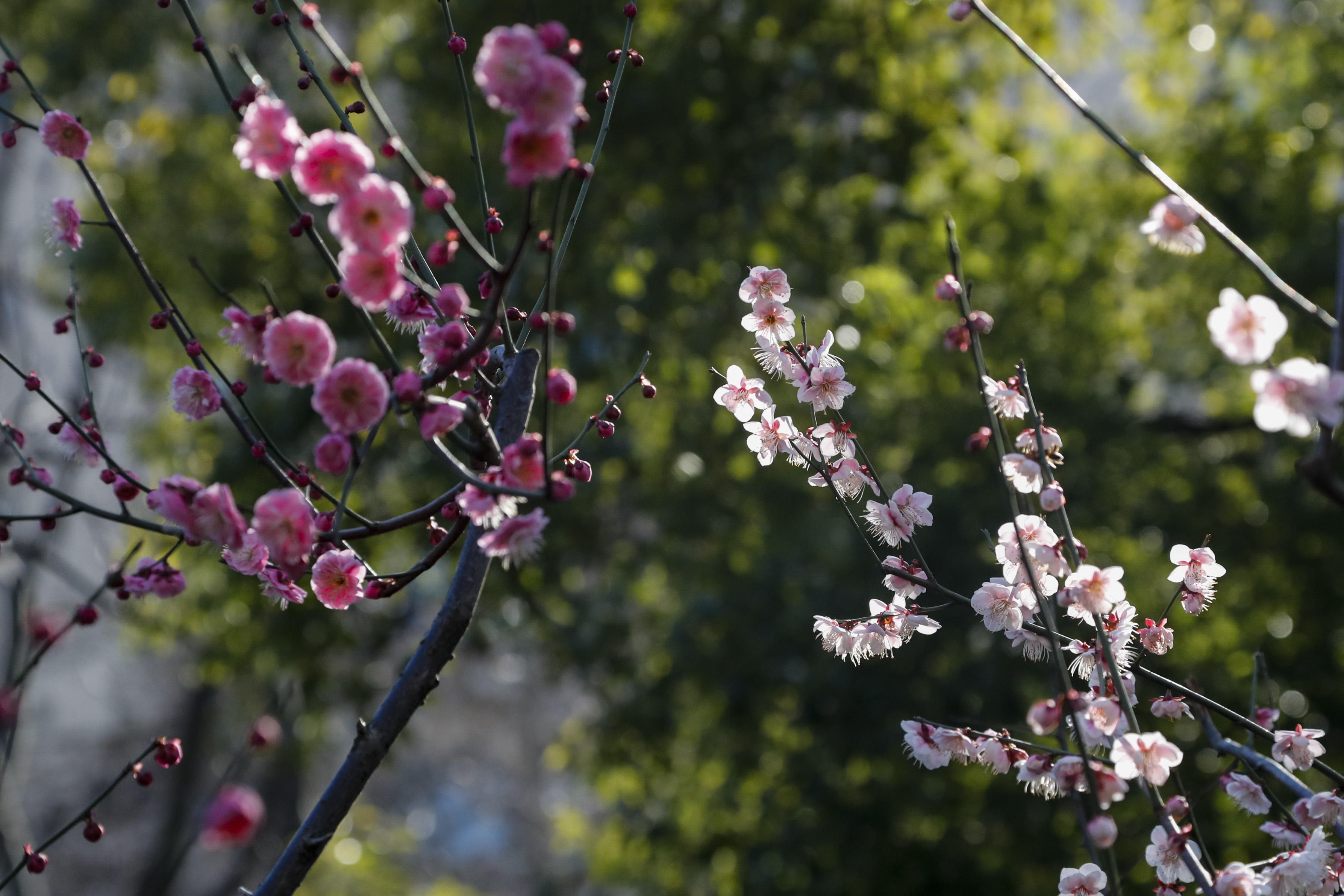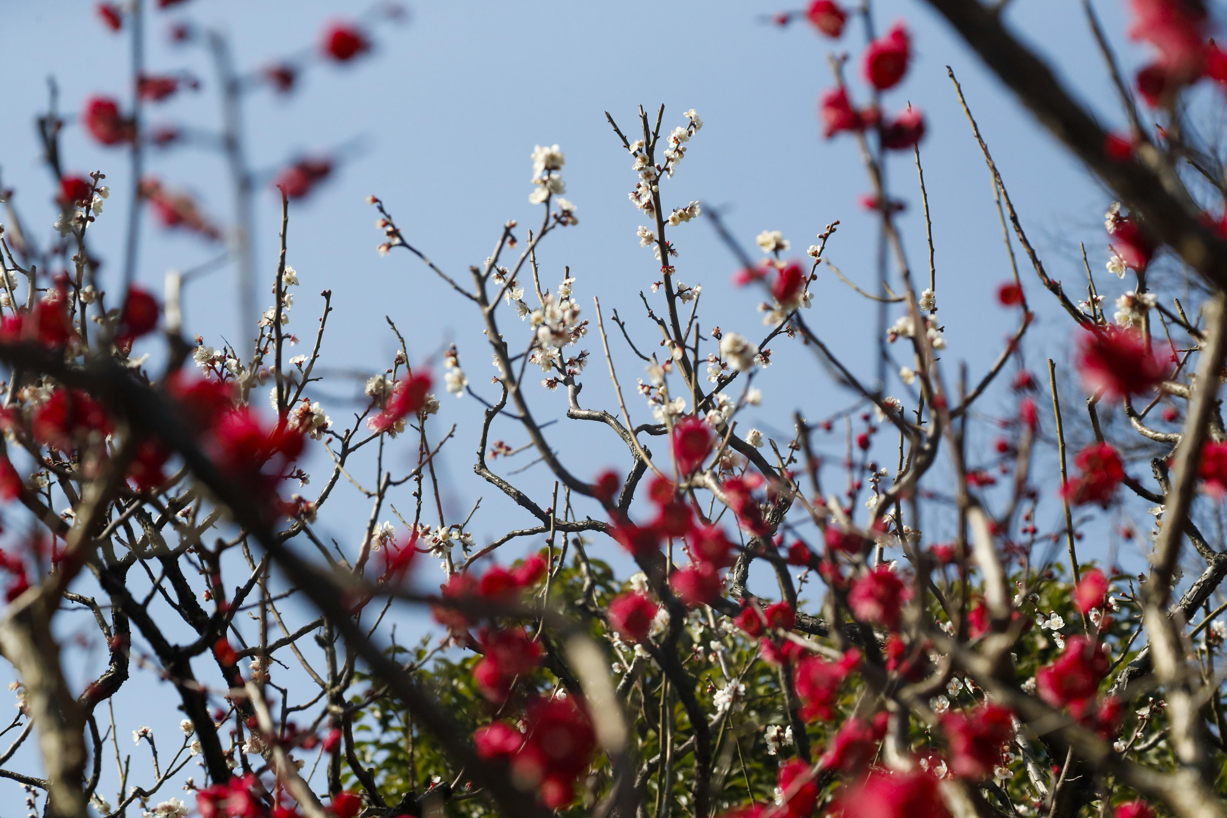 不论是艳丽娇俏的红梅,还是凌霜斗雪的白梅,或含羞半露,或萼蕊全开,都为公园带来了无限的诗情画意。它们多姿多彩,点缀枝头,娇俏可爱的宫粉梅、妩媚艳丽的骨里红和朱砂梅、洁白无瑕的江梅,远远望去,红白相间、层层叠叠。