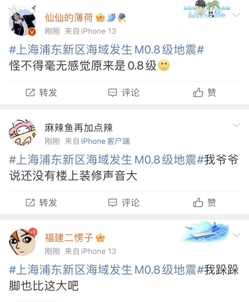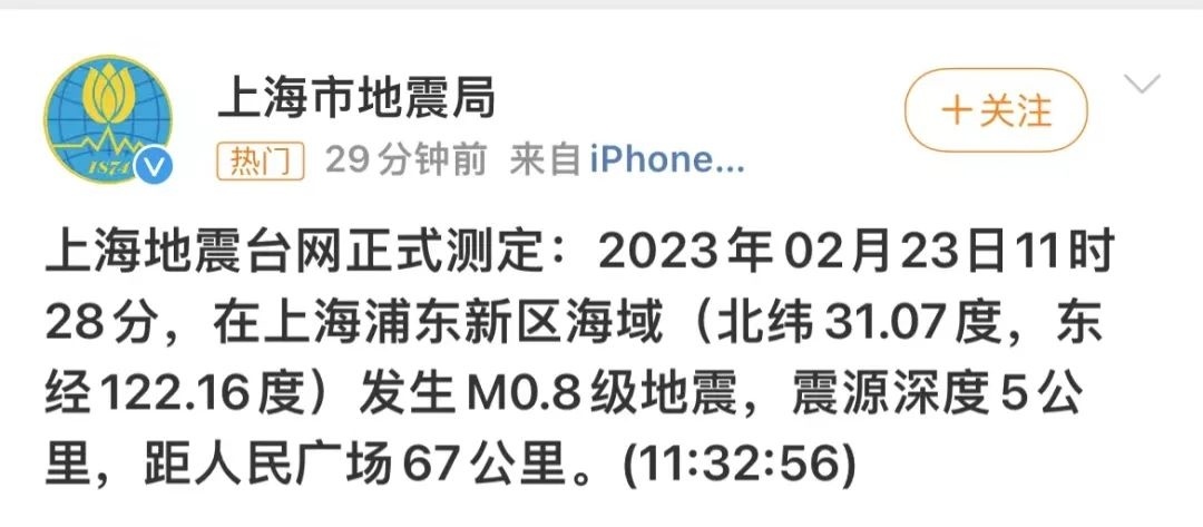 上海地震台网正式测定:2023年2月23日11时28分,在上海浦东新区海域(北纬31.07度,东经122.16度)发生M0.8级地震,震源深度5公里,距人民广场67公里。