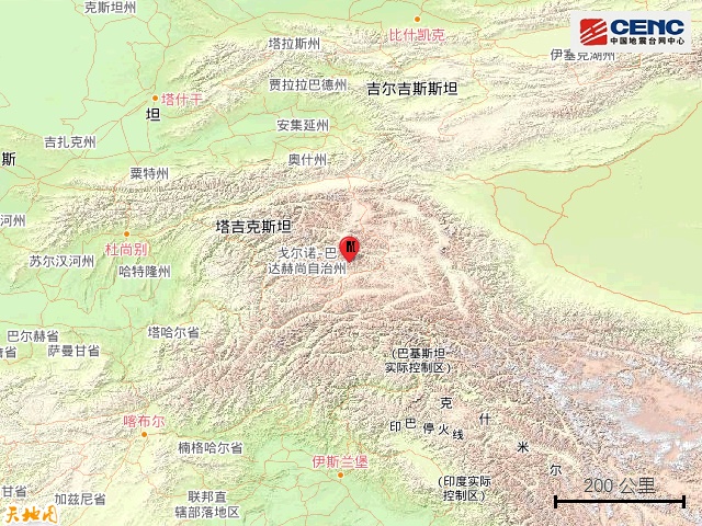 据中国地震台网正式测定,2月23日8时37分在塔吉克斯坦发生7.2级地震,震源深度10公里,震中位于北纬37.98度,东经73.29度,距我国边境线最近约82公里。
