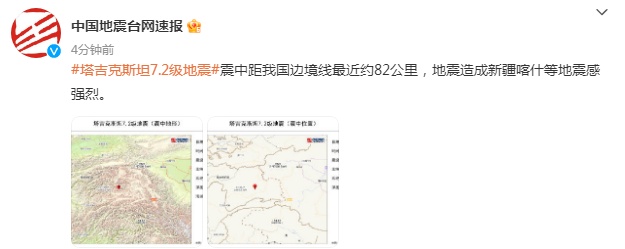 @中国地震台网速报 微博发布消息,震中距我国边境线最近约82公里,地震造成新疆喀什等地震感强烈。