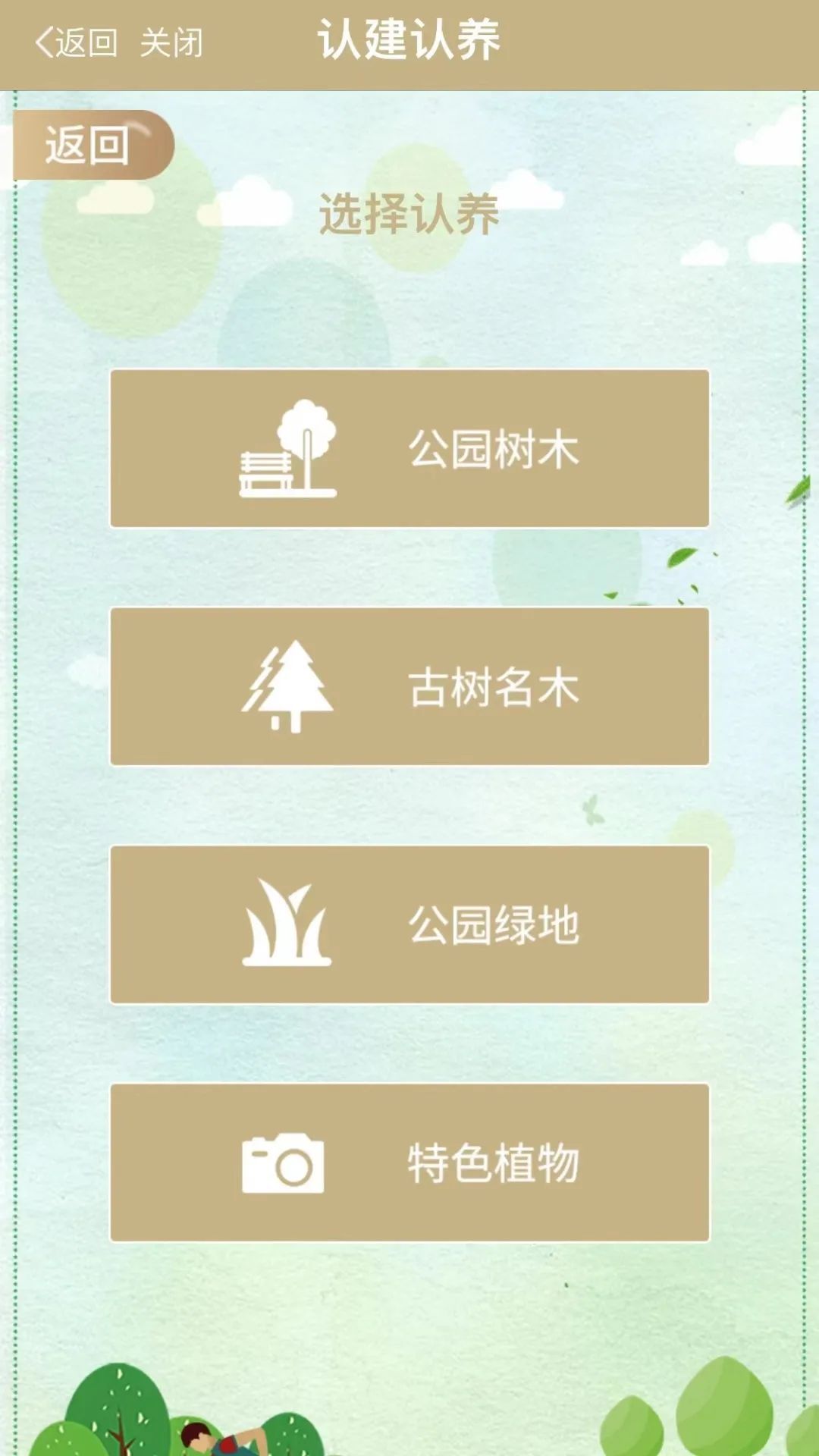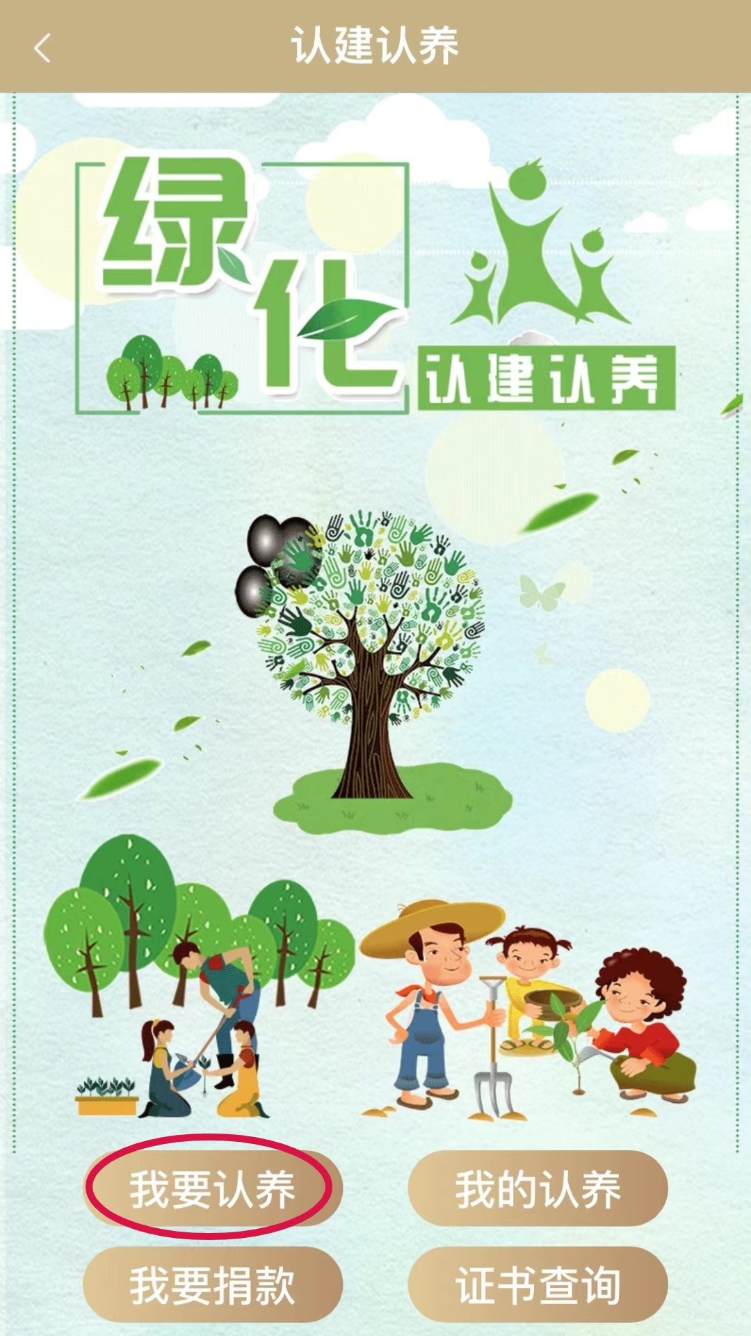 进入绿化认建认养页面后,点击“我要认养”,可查看全市可供认养的绿化信息。