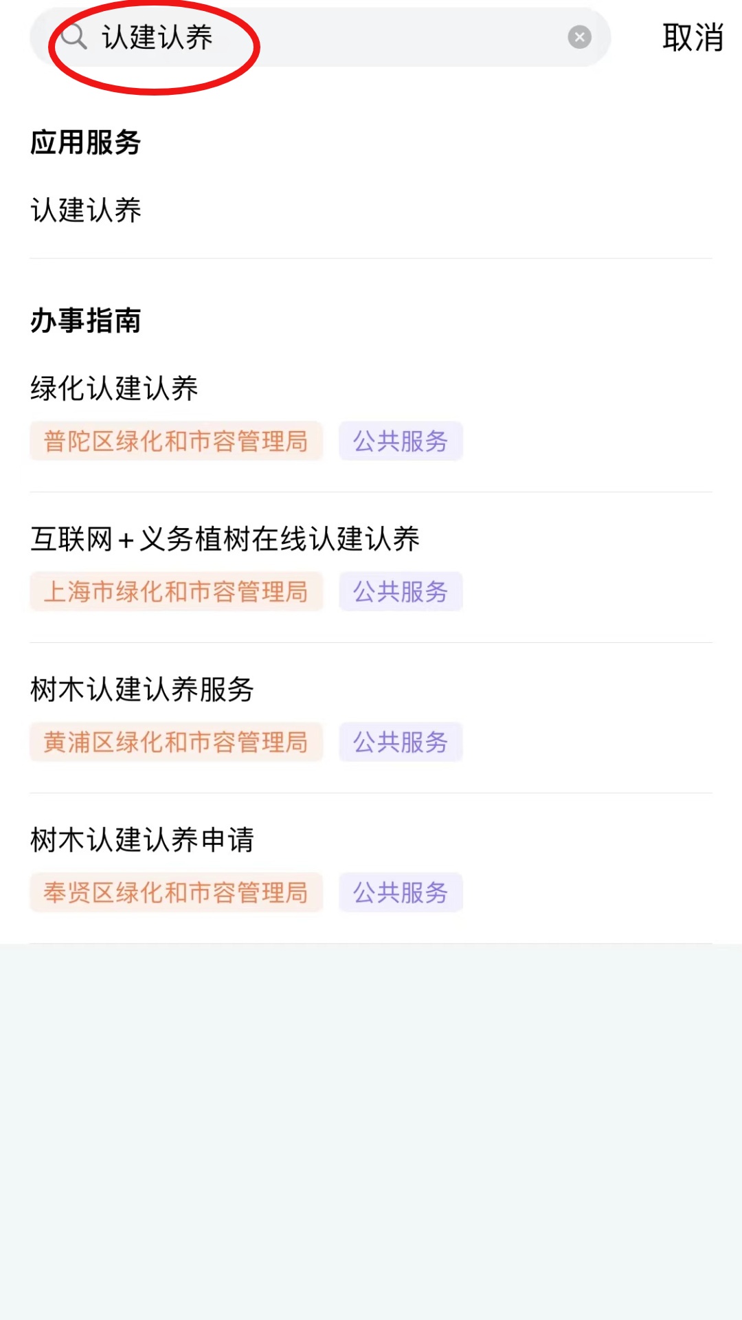 打开随申办市民云app-搜索“认建认养”。