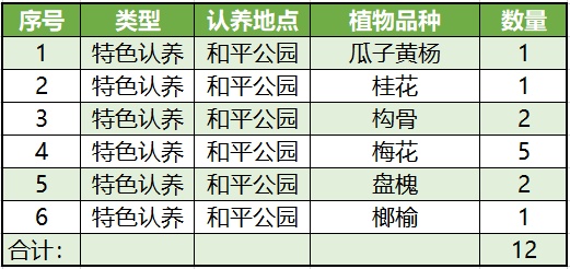 据介绍,特色植物的挑选以造型独特、位置特别、数量较少、色叶开花为选择标准,此次和平公园开放认养的特色植物品种包括瓜子黄杨、梅花、桂花、盘槐、枸骨、榔榆等。其中,落叶乔木榔榆以树形优美、树皮斑驳为特色,其出现在我区特色植物认养名单中,尚属首次。