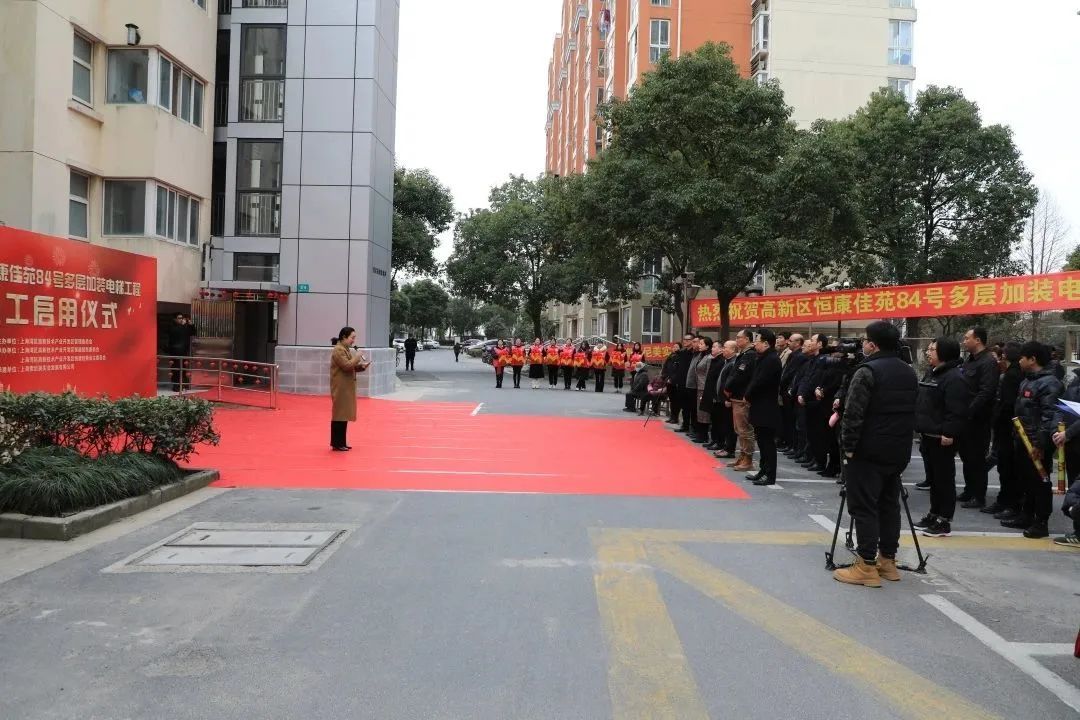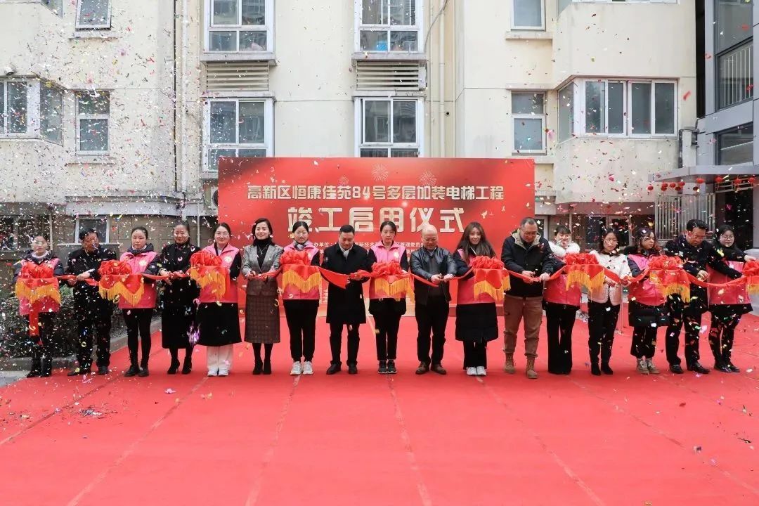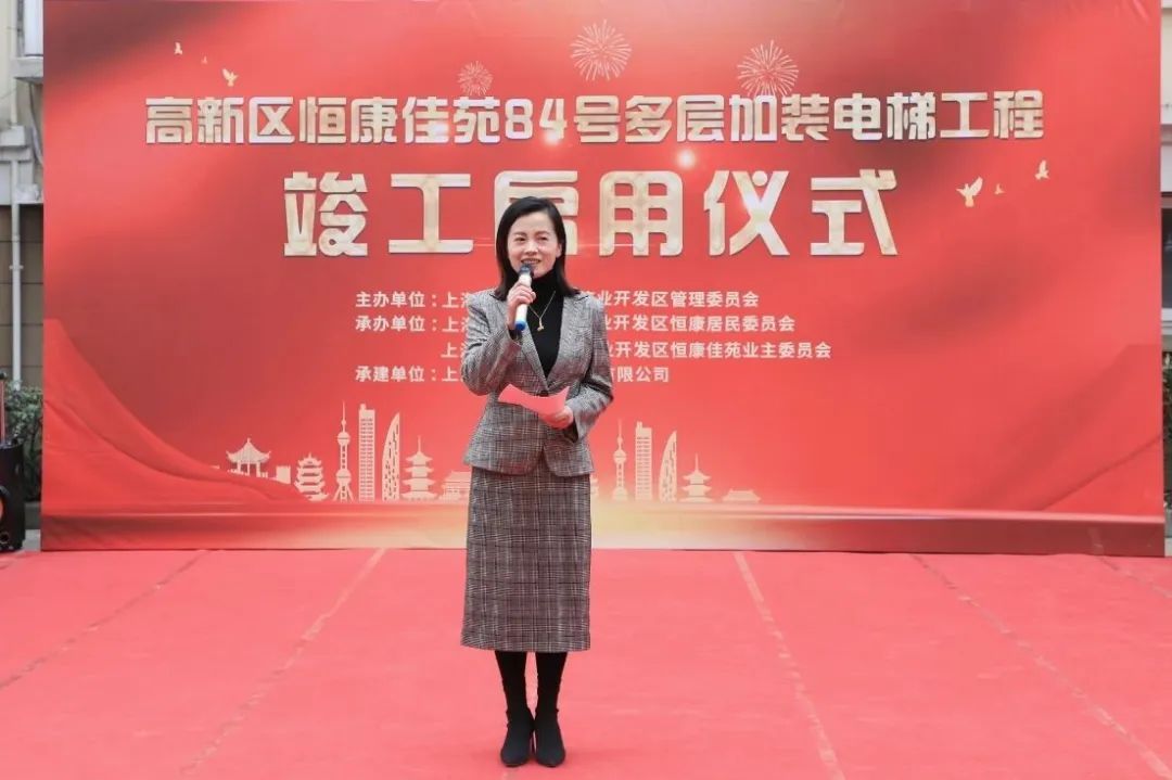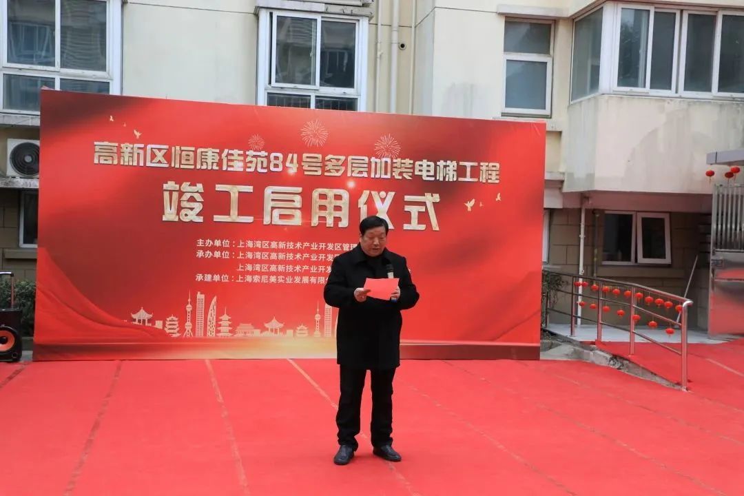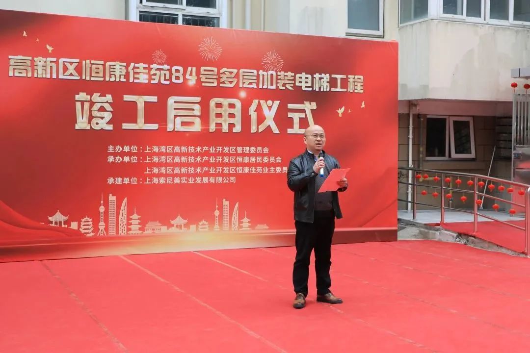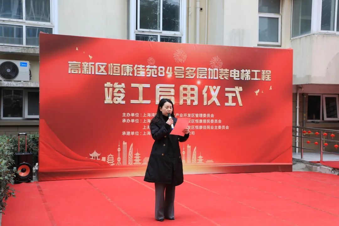 2 月 22 日上午 ,金山高新区首台既有多层住宅加装电梯工程竣工并启用仪式在恒康佳苑84号楼道前成功举办。高新区管委会副主任、社区党工委书记、人大工委主任余飞麟,区房管局党组成员、副局长汤永辉,社区党工委委员杨红妹,社区党工委委员、纪工委书记、监察办主任汤震等出席活动。