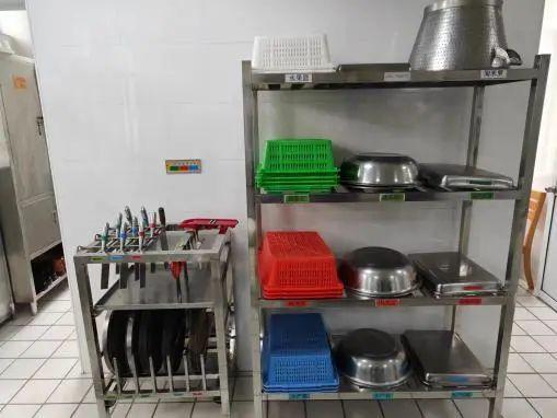 工用具分类清晰,配置净菜、毛菜、水产品、肉类等专用存放菜篮,并用不同颜色予以区分;成品、半成品容器标识清晰,区分明确,有效避免交叉污染。