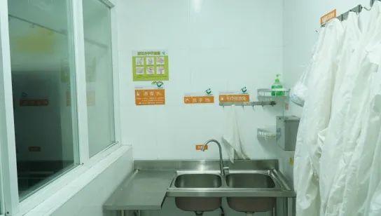 专间管理到位,洗消设备维护良好,手部消毒水配置规范,“三白”专用工作服配置齐全且干净整洁。
