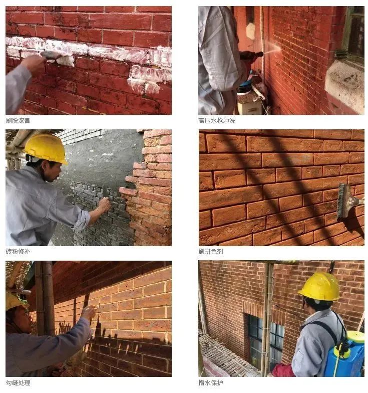 老墙面清理及清洗→泛碱处理→砖粉修复→勾缝拼色→增强处理→防水处理