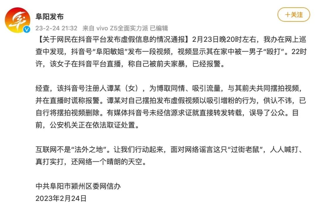 经查,该抖音号注册人谭某(女),为博取同情、吸引流量,与其前夫共同摆拍视频,并在直播时谎称报警。谭某对自己摆拍发布虚假视频以吸引增粉的行为,供认不讳,已自行将摆拍视频删除。有的媒体抖音号未经信源求证就直接转发转载,误导了公众。目前,公安机关正在依法取证处置。