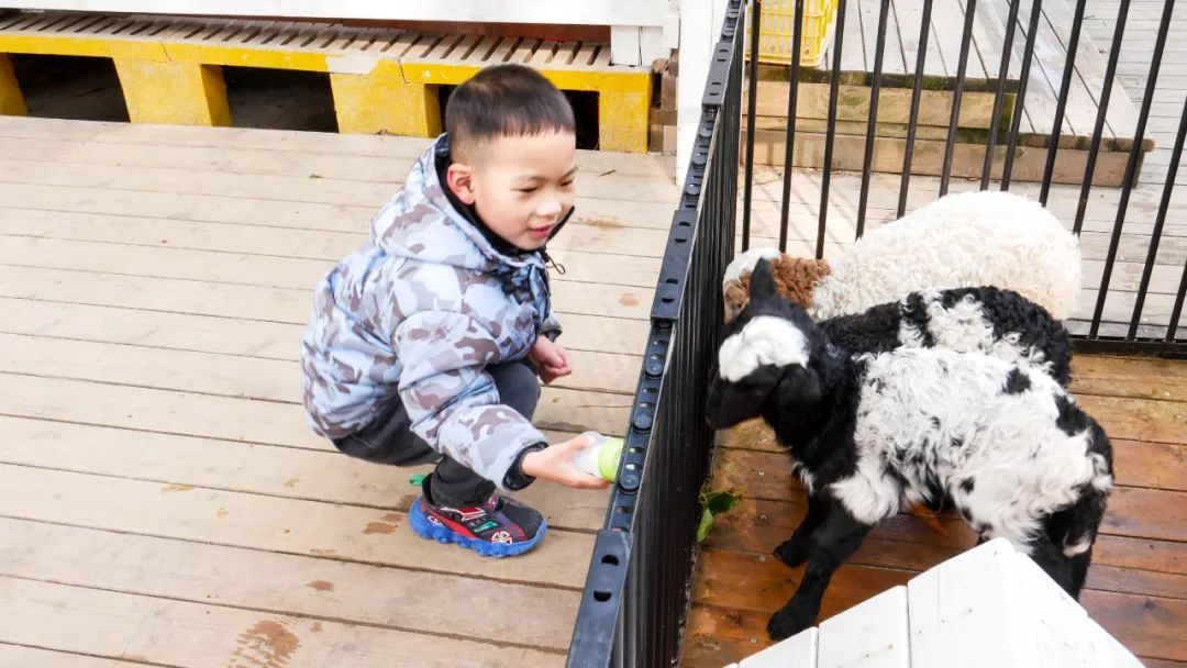 小朋友高绎惟蹲在栅栏前,小心翼翼地将奶瓶递到羊羔嘴边,一脸认真。他的妈妈李女士告诉记者,孩子昨天得知出游计划,晚上差点激动得睡不着觉:“这两年很少出门,刚好这个周末天气放晴,带他亲近一下大自然。”
