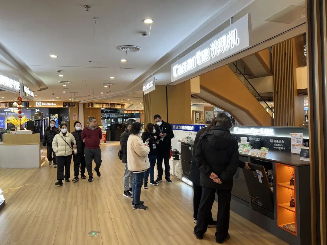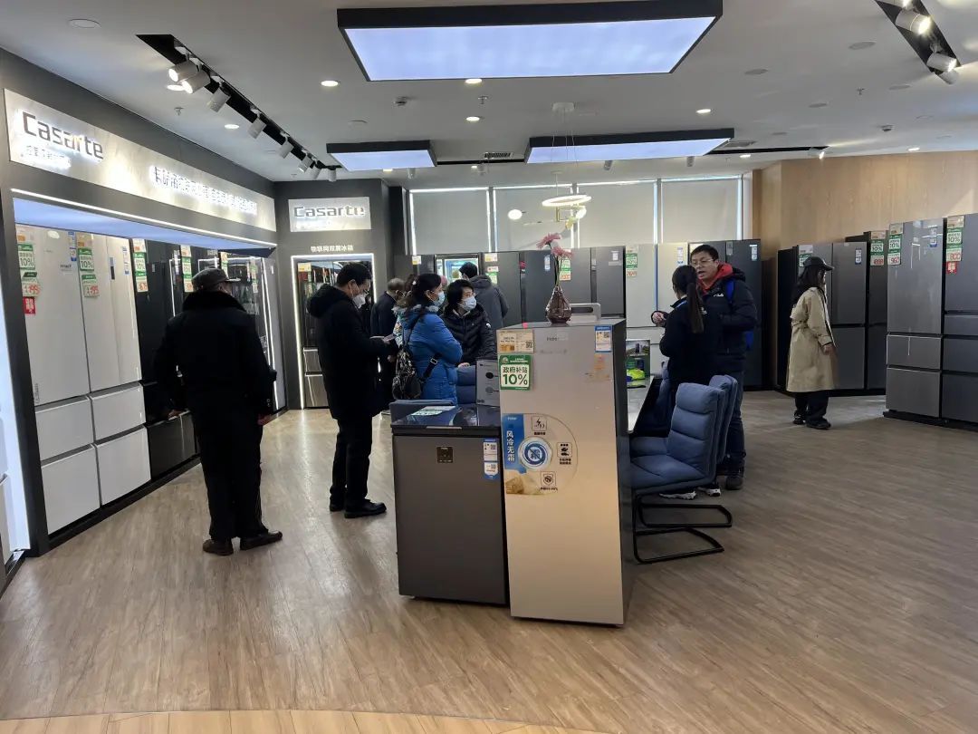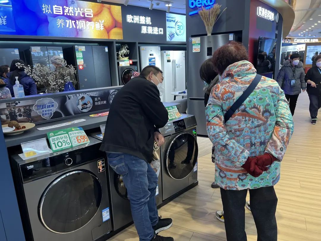 下午2点,记者在苏宁易购五角场店家用电器展区看到,不少顾客在选购商品。有市民在洗衣机展区看中了一款洗衣机,大小合适,价格实惠,直接下单收入囊中。他告诉记者,这款洗衣机有个特点,就是超薄,而他家放洗衣机的地方有点小,这款洗衣机刚好合适,所以趁着这次优惠活动买了。