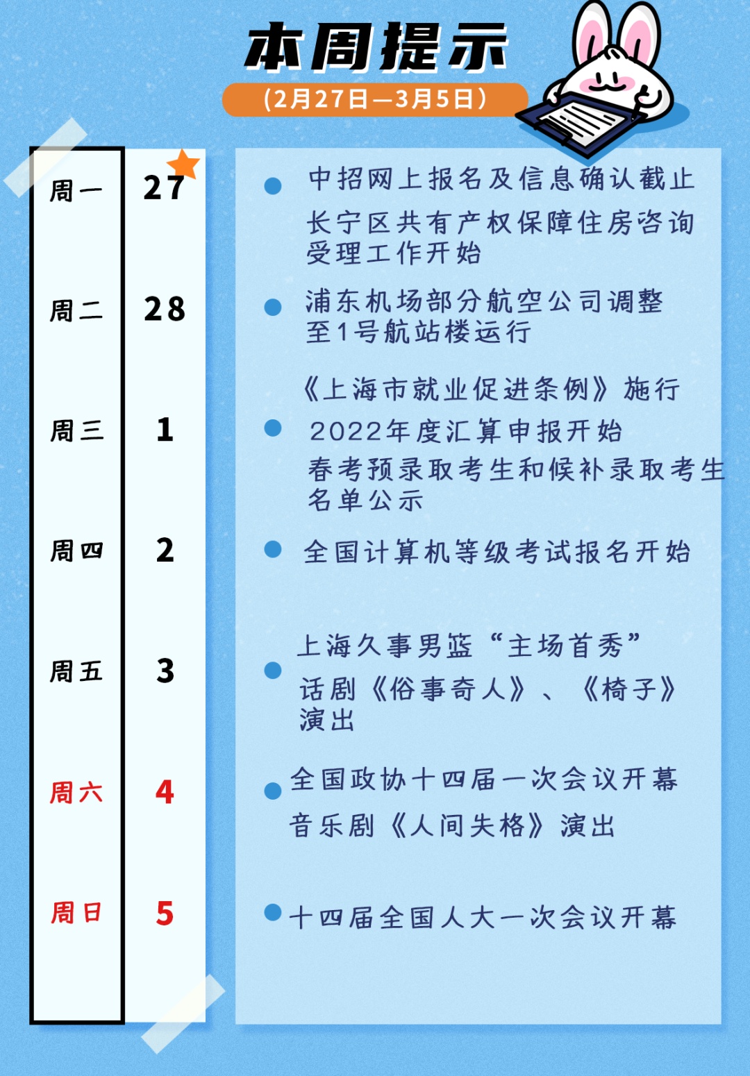 全国两会开幕、2022年度汇算申报开始、就业促进条例施行、上海男篮“主场首秀”、赏花出游……本周还有哪些大事?速看本周提示↓