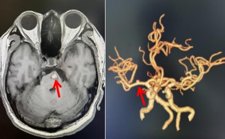 由于患者病情危重、涉及多脏器、风险极高,心内科张英梅教授、神经内科丁晶教授、血管外科董智慧教授、内分泌科李晓牧教授通过多学科会诊,决定通过为患者完善头颅MRI微出血序列及颅颈一体化动脉CTA检查,评估脑部出血情况及脑血管基础,精准评估抗凝治疗相关风险。检查结果显示,患者右侧大脑中动脉小动脉瘤,脑干出血处于亚急性期,病灶主要局限于左侧桥脑,显示为出血吸收期改变。